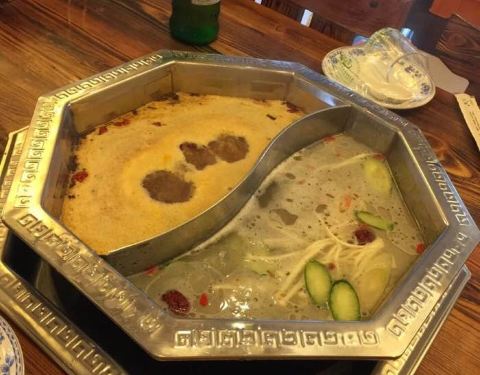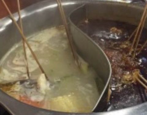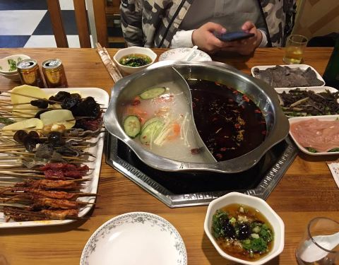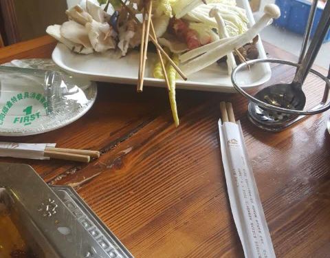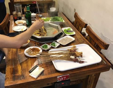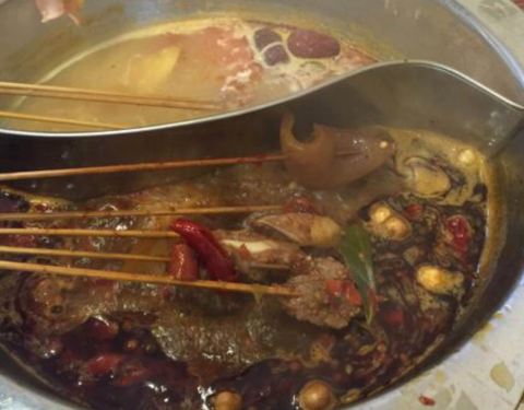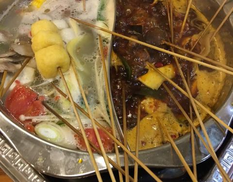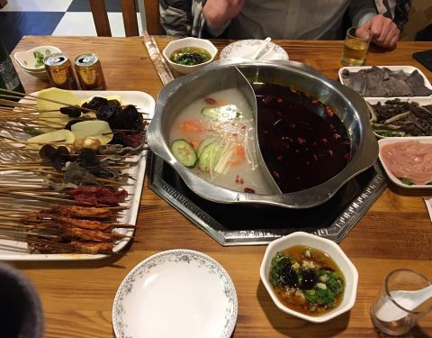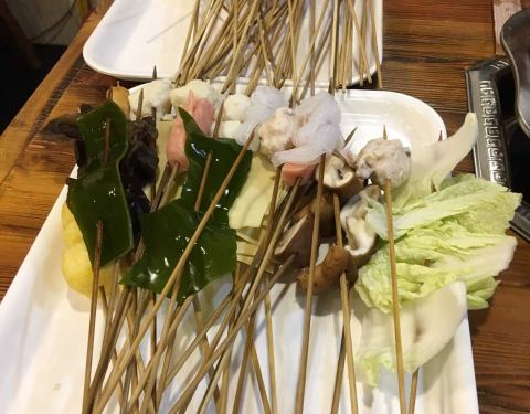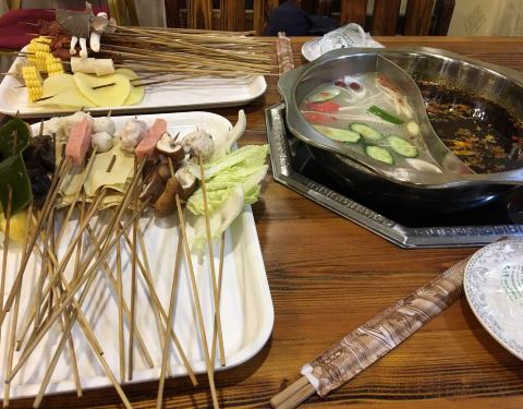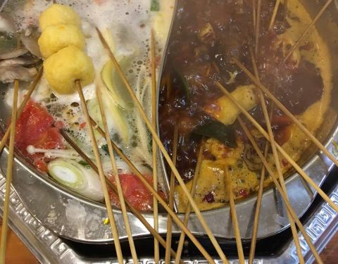 各种小肉串味道都很棒,青菜丸子之类的和火锅没啥区别了!鸳鸯锅,辣锅非常辣,吃着很过瘾