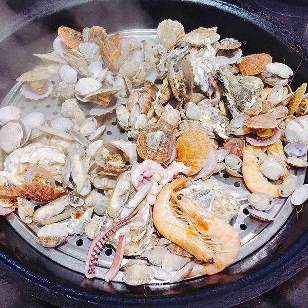 这家店的菜式是点一个锅底,有大棒骨、土鸡、海鱼可以选择,先烧开然后架上蒸架,倒入新鲜的海鲜,盖上锅盖蒸几分钟就好。上面海鲜的汁会留下进去汤底里,然后汤底又可以用来涮菜吃……
