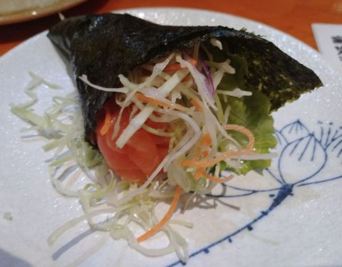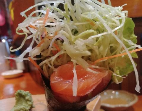 这家居酒屋主打烧肉的,一个人我就吃了个地狱拉面,三文鱼手卷,菠菜沙拉