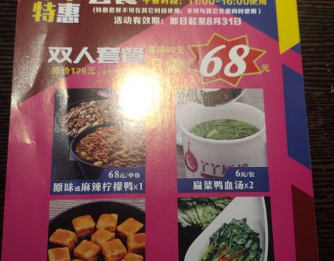 环境很好,不过两个人来有套餐好一点,像我这种走单帮的,点了一个鸭鸭点了一个鸭血汤,吃的好饱鸭~...