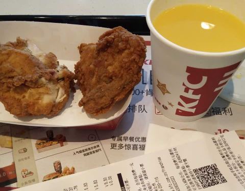 国庆天气真是好~ 晨练完跑KFC吃顿早饭 原来你是这样的芝士猪柳帕尼尼~ 有些惊呆,跟照片也真是差好远~ 拿到手可是干瘪瘪的一只[笑哭] 芝士比较多,浓郁。味道马马虎虎,不如大饼卷万物来的吸引我~ 豆浆总是很烫,基本吃完帕尼尼还不能喝热豆浆[懵逼]