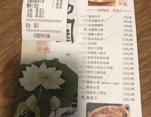 路過這間店時, 依然是被認真做了功課的太太關注到, 二樓露台上的空位也很吸引人。 出門在外, 我一向隨遇而安, 反正手裡有大眾點評, 只要四星以上, 基本還算靠譜。 門口手寫的菜單字跡雋秀, 展示了水鄉人...路過這間店時, 依然是被認真做了功課的太太關注到, 二樓露台上的空位也很吸引人。 出門在外, 我一向隨遇而安, 反正手裡有大眾點評, 只要四星以上, 基本還算靠譜。 門口手寫的菜單字跡雋秀, 展示了水鄉人的文化。 太太依然要了桂花糖芋艿, 我依舊點了雞頭米, 和頭一碗在山塘街吃到的做法不同, 這裡的食材直接選取了整顆的小芋頭, 大小不一, 看著沒那麼統一漂亮, 但味道似乎更勝一籌。 雞頭米只用簡單的清水煮熟, 撒上桂花, 加些許糖, 清新淡雅, 愛到不行, 給出我對此次蘇州之行關於在地美食的最高分。