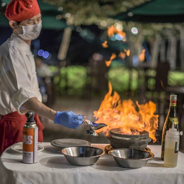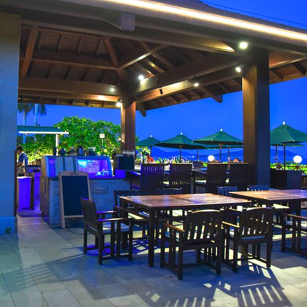 鱼吧海鲜餐厅座落在沙滩上,全敞开式的设计,精巧的木质结构,绝美的用餐环境。鱼吧精选各类海鲜令宾客尽享口福,为宾客打造丰富的美食体验。开放式的厨房设计,使宾客能在用餐的同时欣赏到厨师精湛的烹饪技艺。