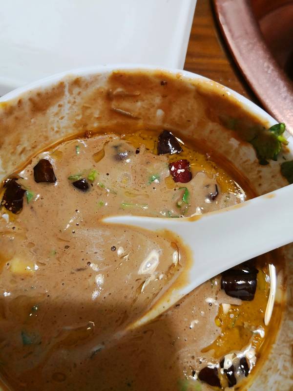 北京的正宗老火锅,生意非常好等了1个多小时,结果却是味道不怎么好,口感也不佳,是来北京吃过最不好吃的一顿了,清汤没什么味道,整体的味道有点不适应,感觉我更适应重庆的麻辣火锅,调料里面的麻酱比较有意思,上面是有字的,我们这份是个囍字