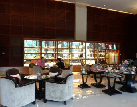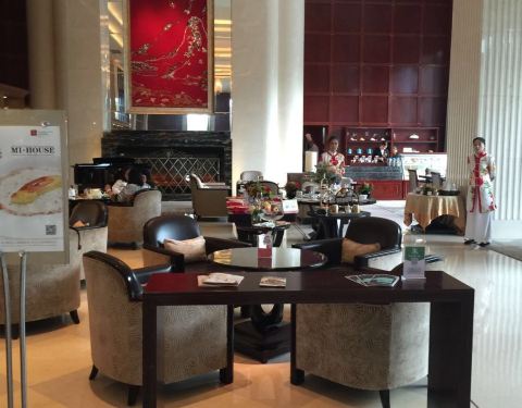 在酒店底楼。我双休日下午在那里用下午茶,本来环境还不错,但正逢Chick in高峰,人多比较吵。服务员都穿着很漂亮的中装,但手忙脚乱水平有待提高。我要的中式茶点,有南瓜酥腰果酥春卷等,味道不功不过,折后98/...