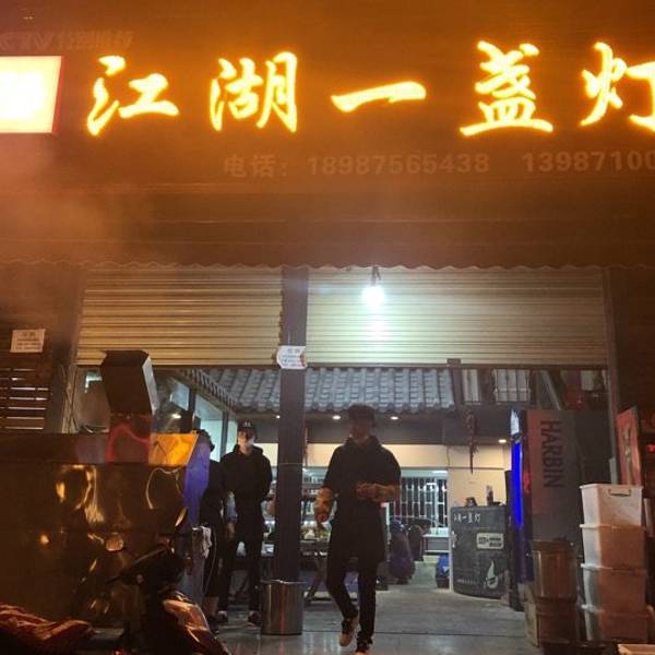 昆明烧烤店江湖一盏灯,现在已经搬迁到海源北路丽阳新城的美食街上。新店的面积更大、环境更好,如鸟枪换炮。 老店因许多客人需要自己扫地收桌子、自己弄作料、自己写点菜单、自己找碗筷、自己找啤酒饮料喝、甚至...昆明烧烤店江湖一盏灯,现在已经搬迁到海源北路丽阳新城的美食街上。新店的面积更大、环境更好,如鸟枪换炮。 老店因许多客人需要自己扫地收桌子、自己弄作料、自己写点菜单、自己找碗筷、自己找啤酒饮料喝、甚至自己要去洗韭菜薄荷……, 更拽的是,如果你等了好长时间没有吃到,去催促老板快点的话,老板一定请你下次再来,没有时间招呼你!牛吧! 说起江湖一盏灯从黑林铺一间小小门面的起步,到今年已经有20多年的历史了,吃过的人已经有几十万罢?那一锅卤水已经熬制了21年,越陈越香的卤水,除了做出传统美味的烤猪脚、烤鸡脚、牛肉串、烤鱼外,还增加了许多的海鲜烧烤新品种,烧烤、小吃、煮品等都齐全了,售卖的品种数量已经达到近百个。 烤鸡脚、烤猪脚是昆明最好吃的烧烤代表性品牌。烤鸡脚和烤猪脚皆是先卤后烤,味道浓厚、香辣过瘾、香辣之中又蕴含了微微的甜味,鸡脚、猪脚在卤水中卤制的时间刚好,不是很耙烂,很有嚼头、口感不错,用大火烤出来,撒上芝麻、辣椒面后,真是爽死人不要钱啊!