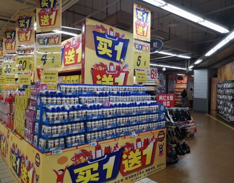 这边的特色就是促销力度特别的大,因为经常都会有买一送一的优惠,这是在其他大润发里面比较少见的,所以吸引了很多人过来这边购物采购。