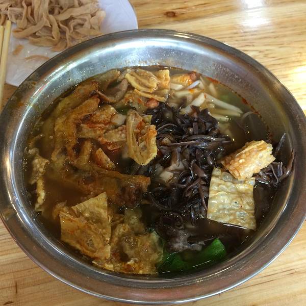放下东西想了下要不要去吃饭,不怎么饿,可是又怕晚点饿了又不想出去,那还是现在去吃吧,下楼走了两步正好看见一家小馆子,人很多的样子,吃米粉的,那就这家吧,正好我还从来没尝试过桂林米粉呢但是进了馆子以后就闻见一股臭臭的味道,心有余悸....但是看这家这么多人,应该不会很难吃吧 看了半天菜单也没有桂林米粉这四个字,但是有螺蛳粉,没什么选择的余地了,要了一碗招牌螺蛳粉15块钱,还有一瓶豆奶3块钱超大一碗,比脸大 本来我想要不辣的,但是无奈底汤就是微辣,只能这样了 可以自己加香菜葱花,还有辣椒,我加了三勺葱花三勺香菜 同时我也发现了,进屋闻见的那股臭臭的味道原来就是这个螺蛳粉的味道。。。。我的天哪,好害怕吃起来也是臭臭的,先看看都有什么料吧先从比较显眼的看起 有几块炖牛肉,炖的还算软烂一只鸭掌,应该是油炸过一下的,单吃是没什么味道的,要用汤泡一下 同时尝了一口米粉,很劲道,而且惊喜的是,只是闻着臭,吃起来还是挺好吃的呢!!还有花生,木耳,白萝卜,生菜,肉糜,笋丝,等等,很多料 白萝卜很好吃,是类似泡菜里的那种腌制过的白萝卜,有点甜,很爽口这个黑色的应该就是螺蛳了,刚看见第一个的时候我还以为是脏东西。。给扔出去了。。。 后来翻腾了一下发现里面还有不少,夹起来看了下才发现这个是螺蛳啊。。。。。。 没想到这个米粉这么好吃,一下就唤起了我的食欲,这碗米粉仿佛对着我说:小样儿,怎么着,好吃吧?吓你一跳吧?没见过吧?啦啦啦 .... 好!大口开吃!!! 就在这个时候突然一个大婶咣当一下坐到了我的对面,拿了一大碗米粉和一瓶豆奶。。吓了我一跳,因为我是一个人特意选了一个很小很小的一人桌自己吃,没想到这样也能拼桌...好担心她的米粉掉下去 这时候我又去放了三大勺葱花和三大勺香菜,端回来的时候惊呆了大婶这个是豆奶,味道不错,当然,远的那瓶是大婶的 我俩几乎是头顶着头,安静的吃完了各自的米粉,相视一看,点头微笑,擦嘴离去在街上溜达了二十分钟,伴随着广场舞的曲子,走回酒店,早点休息明天进山