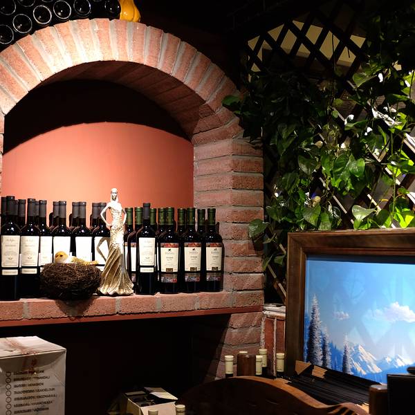 很适合情侣约会进门处的右侧有吧台区域餐厅门口摆放红酒的区域
