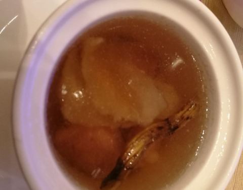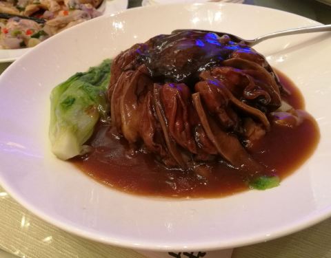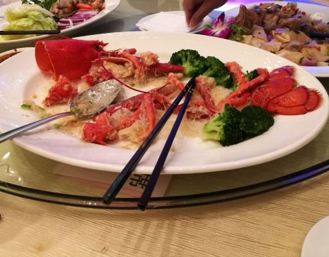 作为五星级酒店的中餐厅,环境是一流的,服务员的态度也很好,至于出品的菜,味道过得去,不过上菜速度有点慢。今晚有烧羊肶,蒜蓉粉丝蒸波士顿龙虾,有蠔豉发菜大利,清蒸和顺鱼,白切鸡和炖汤以及糯米饭。