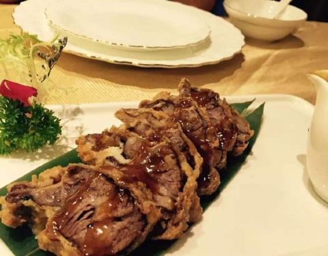 餐厅应该是由酒店几个大房组成,最大的房有7、8张台,虽然小了点,但环境及餐具摆设都不错,原来怕没有位置提前订位了,最后整晚只有6个人。可能人比较小,服务很好,茶一喝完立刻会过来加。菜式摆盘不错,但味道比较普通,牛扒不错、虽然不是靓牛扒但做法比较特别.羊扒煎得比较老,炒饭分量很足,两个人食不完。菜单点的价格不贵,但要加收16%服务费.