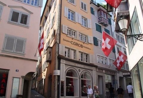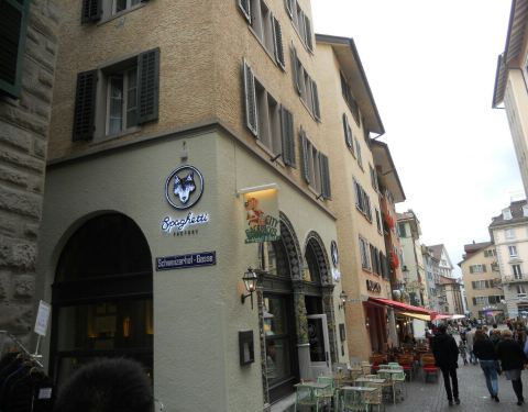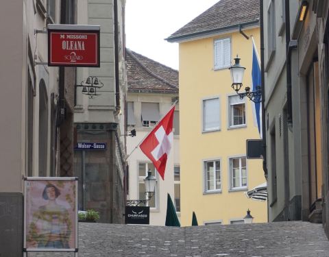 南北走向的尼德道尔夫,在利马特河东侧。长约1公里的小巷,从早到晚热闹非凡,是体验苏黎世旧城区独特风貌的最佳场所。 拍拍~鹅卵石铺就的狭窄街道,两边是哥特式风格为主的老建筑,外墙五彩斑斓,旗帜漫天飞舞,游客熙熙攘攘,随手一拍,张张是大片。 买买~拱型回廊下,名品店、礼品店、古董店、书店,琳琅满目,应有尽有,但价格小贵。 吃吃~餐厅、咖啡馆、甜品店、小酒吧,林林总总,可以随处品尝世界各地风味的美食,感受苏黎世多民族混居城市的特点。