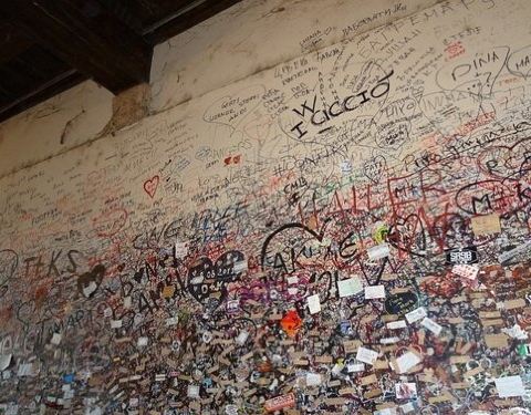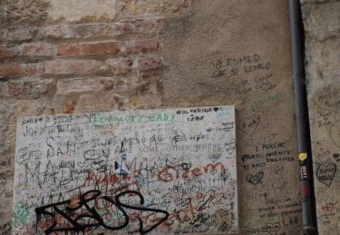 并没有刻意要来寻找罗密欧故居,我们只是来到领主广场的时候,在附近随意的走走,然后就看到了这一扇大门。旁边的牌子上写明了这里是罗密欧故居,不过大门紧闭,目前依然是私人的住宅,所以不对外开放,高高的院墙也是不可能随意翻得过去的。虽然这里是私宅,但依然免不了有无数的莎翁粉丝来到这里,附近的墙上和朱丽叶故居一样,满是涂鸦和爱的誓言。