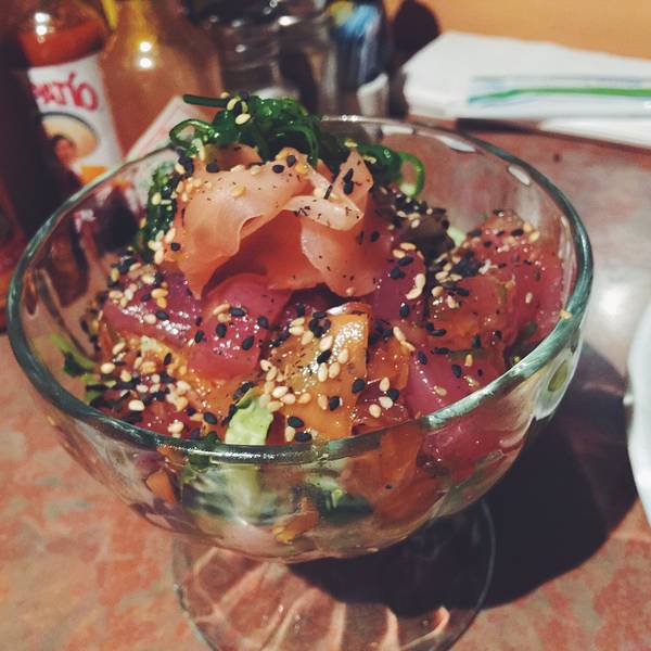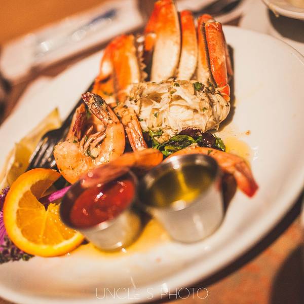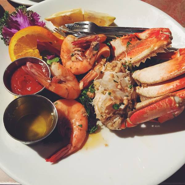 当时我们还没意识到最最悲剧的事情——没地方吃晚饭。 卡梅尔的餐厅其实很多,饭点的时候每个街角都能闻到餐厅传出来的阵阵香味。但问题是,只要yelp评分稍高一些的餐馆全部爆满,而且队伍都排到店外了。我们一连走了好多家,每家都让我们败下阵来。于是我们转悠了好半天才决定去老渔人码头吃海鲜去! 事实上老渔人码头并不是bnb住家男主推荐的地儿,他觉得那种地方都是骗游客的,吃不到好吃正宗的海鲜。他推荐了一家本地人非常喜欢的海鲜店:Monterey Fish House,在从Seaside到Monterey的路上,随便yelp一下就能找到。不幸的是这家餐馆今天假日不开,我们打了好多次电话也没人接,之前开车路过也看到店门紧闭。 但是吃了那么多天快餐我想吃顿海鲜,弥补一下之前没吃到Crab House的痛。所以我毅然决定去老渔人码头找吃的。 Yelp上找了家叫Grotto Fish Market,看着评价不错。其实到了发现这里的店都差不多,每家生意都挺好,有时也都还需要等位。我们去的时候正好有个靠窗两人位,想也没想就进去了。 我要了一份螃蟹和虾,胖叔要了一份三文鱼芒果,还点了一个吞拿鱼牛油果沙拉,海鲜浓汤貌似是送的,我不太记得清楚了。只记得那螃蟹和大虾吃的我好辛苦,刚吃完发现自己还点了那么一大盆吞拿鱼沙拉。顿时觉得好无助。这家味道还不错,至少我非常喜欢,当一次游客吃一次游客专属料理也不赖。