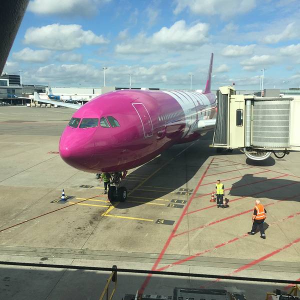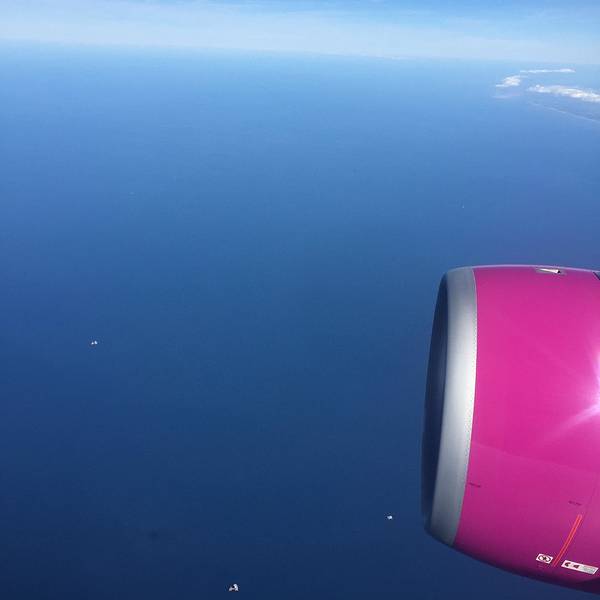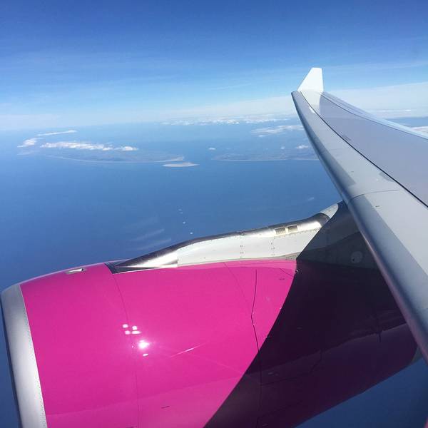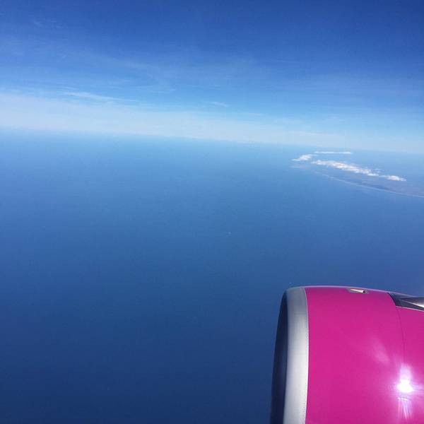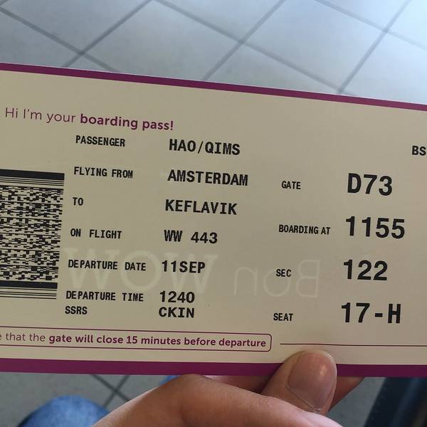 我们是从荷兰阿姆斯特丹(关于阿姆斯特丹机场我有很多吐槽,请见欧洲行游记)飞往冰岛首都雷克雅未克的,乘坐的航空公司是WOW air,喷涂是紫色,非常好看,它应该算是飞冰岛的最便宜的航空公司了。因为是廉价航空,买票的时候一定要注意买行李,托运行李 check-in baggage,随身行李carry-on luggage,别搞错了哦。如果没有在网上买行李的话,去机场买会非常非常的贵,甚至比机票价格还贵。
