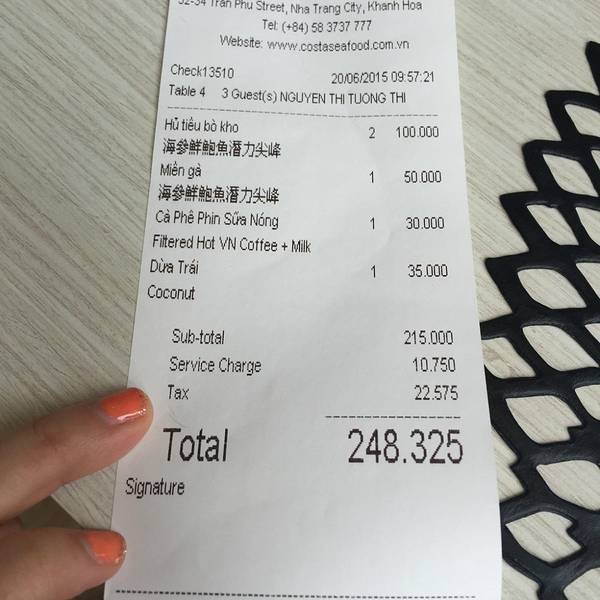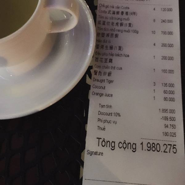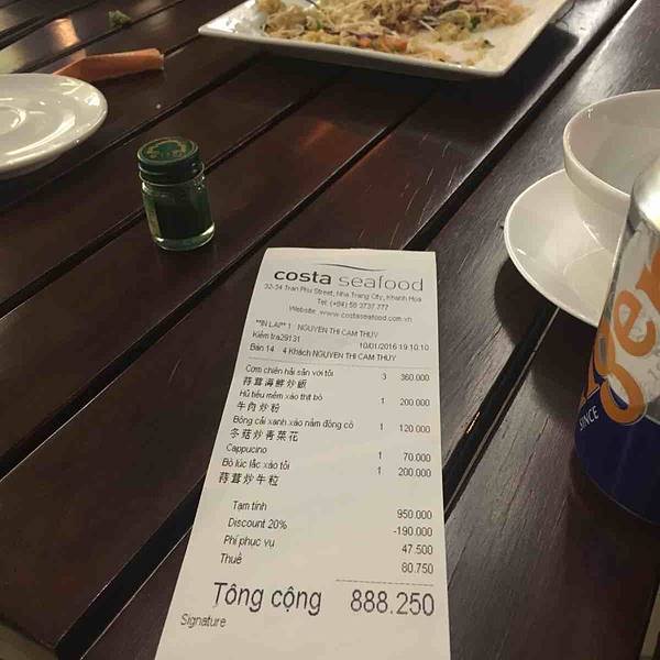 4点半左右离开了I-resort回到酒店5点左右。在酒店休息了片刻该想想今晚的大餐吃什么了? 因为入住洲际,旁边的食肆相对来说比较多,看了Costa seafood网络评价很不错,而且就在洲际楼下,就决定第一晚就它了,关键它也着实没有让我们失望。出门在外,大众还是靠谱的!Costa seafood的环境在芽庄也算是上乘的,室内灯火通明,装修简约大气,室外虽然幽暗,但好在烛光可以将浪漫气息蔓延,正对着沙滩,丝丝凉意,看着马路上过往的车辆和行人,晚餐甚合我意。实在觉得这样的兼容很难以做到,但costa seafood却结合得相当的妙!点菜期间,有对应的中文的menu,对于我们来说方便不少。就在英文点单期间碰巧碰到了一名会中文的服务人员,服务态度好,交流没有一点问题。在芽庄,怎么能不点tiger啤酒呢啤酒配海鲜,最佳组合拍档!更为我们第一天的圆满结束cheers!越式春卷,也算是每餐必点的。不同于国内传统春卷的只是里面的馅略有不一样,国内也可以仿效和借鉴,使春卷也可以多样化些。国内普遍以韭黄、肉丝、香菇和笋为主要原料。越式春卷多样化,造型也不一样,costa seafood的春卷和国内比较相似,原料以芒果,虾肉为主,是不是听着就觉得比较新鲜和好奇,不用担心味道怪异,costa seafood将我们中国人觉得怪异冲突的食材混搭的很好,味道也是很不错的呢。老虎虾的个头只是略觉得小了点,味道还是不错的。当然自我觉得和普吉岛的the first restaurant的芝士虾还是差一点。但在芽庄,这样的水平绝对已经很OK了。烤生蚝,50000VND一只,算比较划算。生蚝生吃有些人还是后怕的,芝士的相对来说可以减轻生蚝本身那一股海产味,让芝士的浓郁覆盖掉生蚝的腥味。濑尿虾,怎么说呢?肉质肯定比我们这边好。但个头比起普吉岛还是小了点…可怕的就是比较,人怕比较,这年头虾也怕比较…一比较就会有对比,就会有优劣…在costa seafood吃晚饭,那感觉肯定比照片和视频拍出来的好不知道多少倍,有些感觉并不是通过照片美颜视频记录可以诠释你当下最直接的情绪。往往面对美景我们会词穷,或者不知道怎么表达,“好美”“好漂亮”会是最常用的词… 我的满意度取决于你们脸上的笑容,如此美景,有你们真好!这一餐我们是直接付了相当于1980275VND的90美金,凭洲际房卡可以打9折,现在不来更待何时。 餐前服务好毋庸置疑,餐后服务好并不是所有餐厅🍴都会做到的。由于点了海鲜有些多,餐后服务员会递上姜片让我们驱寒,缓解吃海鲜的生冷感。 另外在剥完PP虾后,也会奉上青柠茶叶水,让我们洗手擦拭,去掉手上剥完虾后残留下来的腥味。 虽然只是两个小小的举动,但让我们心里感到一丝丝暖意。细节决定好感,服务体现在细节,所以好评度高也是实至名归的!