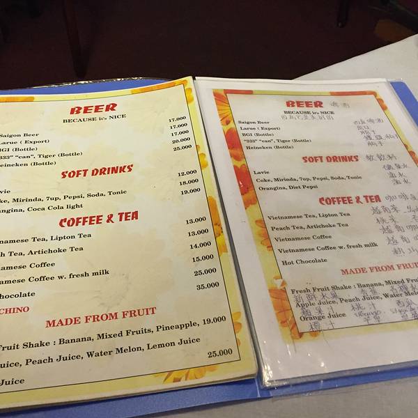 我们想念西贡的Fruit Shake,来到大叻依然想寻找它的踪影。 看到大众点评说这家有果汁,就导航来尝尝,很是失望。只是果汁加冰而已。。。19,000VND一杯。原来在大叻是没有Fruit Shake的~~~~(>_<)~~~~ 有中文菜单,还有其他吃的,火锅等。但我们还是选择回大叻市场吃火锅