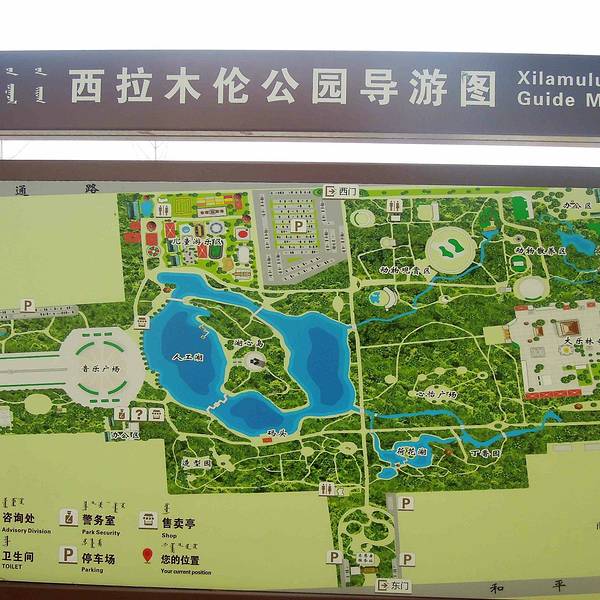 公园远景以人工湖和马头琴组雕为中央景点,设花卉观赏区、园林树木观赏区、动物观赏区、儿童游乐区、文化娱乐区、湖面游乐垂钓区等六个功能分 西拉木伦公园(5张)区。公园园中湖面积26400平方米,各种动力游船40艘。花卉观赏区面积5000平方米,园林观赏树木63个品种,3万余株,有观赏动物22个品种300余只,儿童游乐区占地面积3万平方米,各类游乐项目32个。公园主要建筑有凉亭2个、水榭1座、障景600立方米,曲桥1座、拱桥1座、平桥1座、旱地喷泉1组,还有动物馆舍10处。园内广场、道路、活动场地硬化面积82000平方米,各种照明灯260组。2001年,西拉木伦进行改造,拆墙透绿,实行开放经营,免费游览。