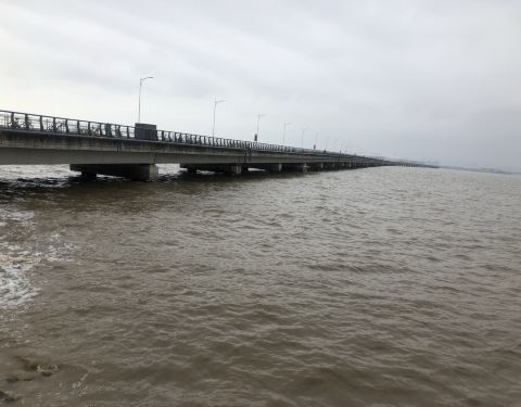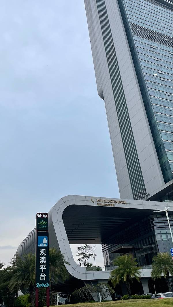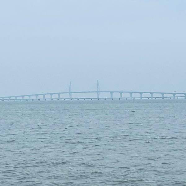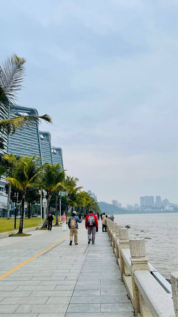 珠海。拱北海边观海。远处港珠澳大桥。 你在网上看到介绍观澳平台都是这样的: 拱北观澳平台:这里是观赏澳门风光的绝佳位置。站在平台上,你可以一览澳门城市的壮丽景色,两岸的独特魅力尽收眼底。无论是白天还是夜晚,这里的景色都别有一番风味。 遗憾的是我们到的时候是阴霾天气,能见度不高。