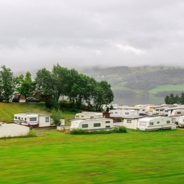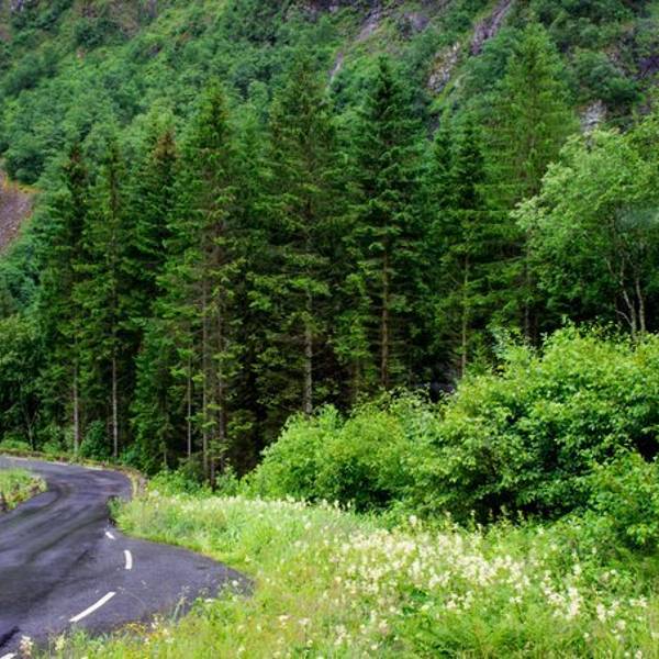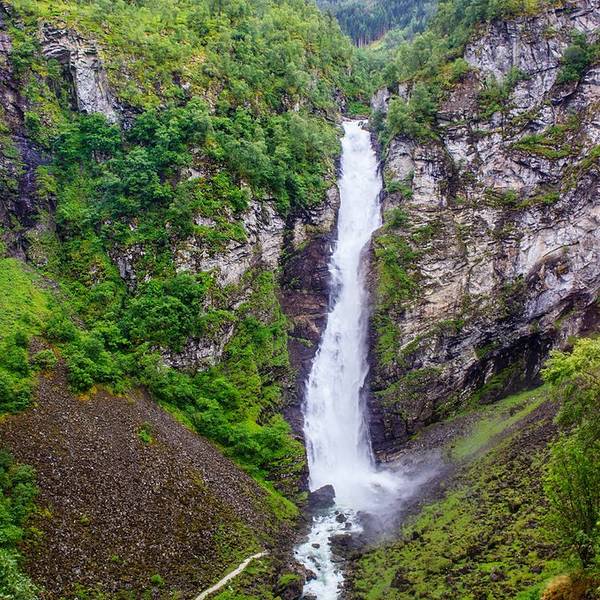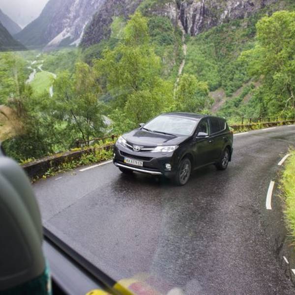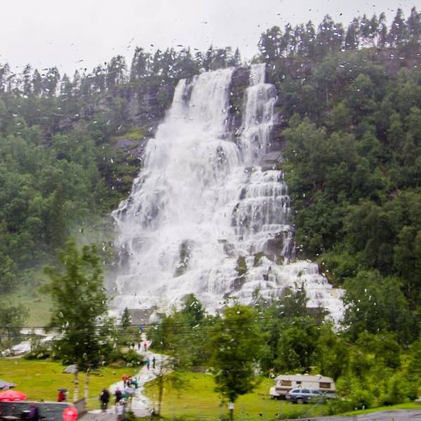 烟雨朦胧中,开始出现梦幻般的色彩,貌一看还以为来到了瑞士!忽然看到路边一大片房车集散地,要是国内也有这样专为为房车设置的停泊空间就好了,房车市场一定会更火!(职业习惯又来了,造车的人一看到汽车就两眼放光啊)继续在平地上行驶,前进方向左手边很快会看到Tvinnefossen瀑布,水势挺大!这里开始,进入峡谷地区紧接着,便是山路18弯!每到一个拐弯处,司机师傅都会慢速让我们好好欣赏壮丽的山间峡谷,确实很美!坐在车里能明显感觉,我们再以很大的坡度下行,真的佩服司机的车技,每次到拐弯的地方,都为他捏把汗,真不是一般人能开的!