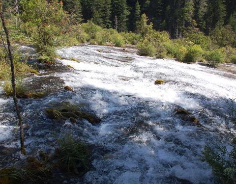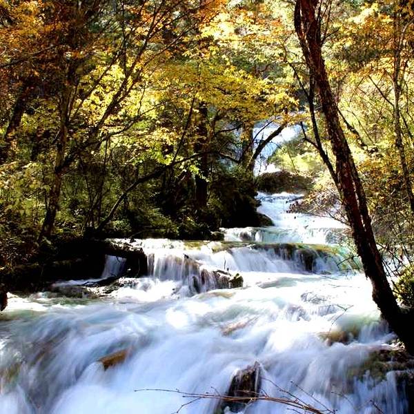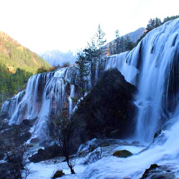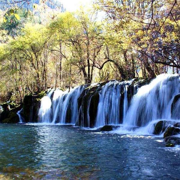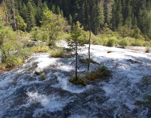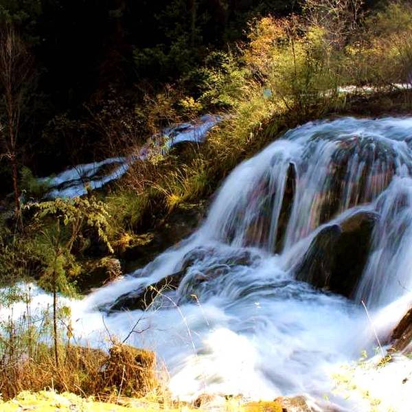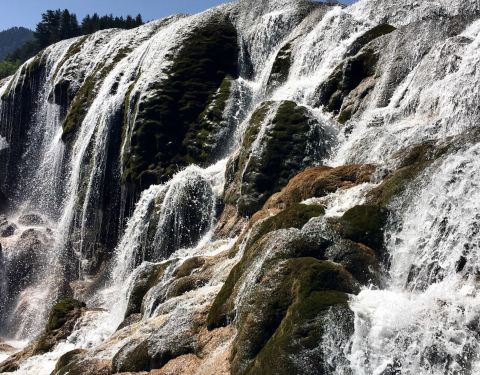 九寨沟风景区内的珍珠滩很大,水流在一大片的平缓台面上急急地下泄,在与不同的石头冲激后,迸发出一片小水珠,在阳光下就象是珍珠一般。