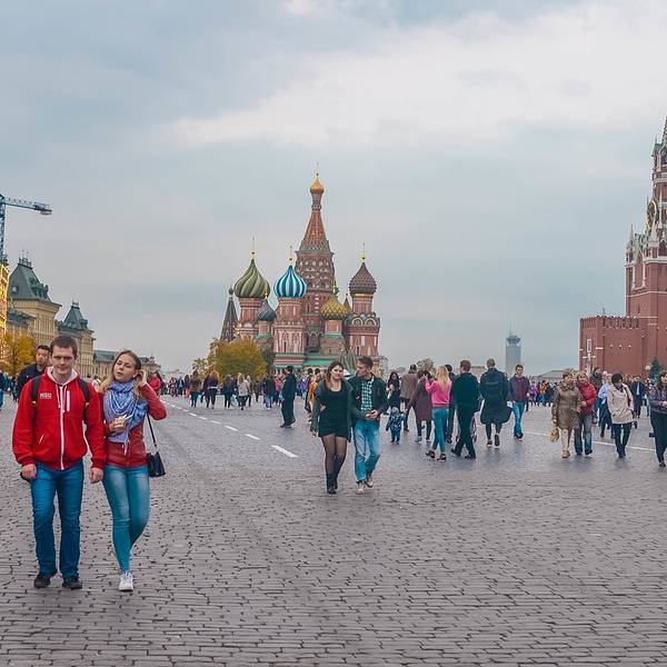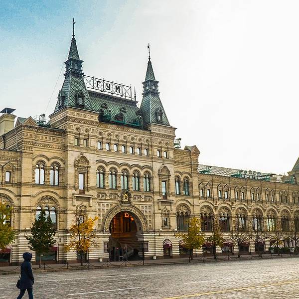 享用一顿大餐之后又习惯性的“饭呆”,连最有名的叶利谢耶夫食品店都勾不起我的食欲了。不过在这座装饰仿佛宫殿一般的“超市”购物,总会让人的关注点聚焦不到食品上。这家店由圣彼得堡商人耶利谢耶夫1901年开设,内装豪华拉风。24小时不受限,体验当年上流社会的消费环境,完美。店里货物齐全、摆放漂亮、价格合理。挑选手信送礼来这家最省心,推荐鱼子酱、熏肉香肠、自产糕点、巧克力糖果。俄罗斯最出名的鱼子酱在熟食柜台后面系着围裙,戴着可爱帽子的柜员奶奶。诱人的各式甜品、蛋糕我们简单买了第二天的早点和酸奶,沿着特维尔大街高楼林立的商铺散步,最显眼的或许就是一家俄罗斯运动品商店了,后面还会提到与它的缘分。再回到红场,游人已经密密麻麻的聚集在这里,完全没有清晨开阔安静的模样,也庆幸我们每次旅行都有早起的好习惯,可以离心目中的景色更近一点。现在的目的地不再是被游人包围了的大教堂,而是左侧最著名的“古姆百货”。