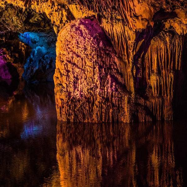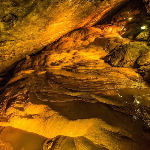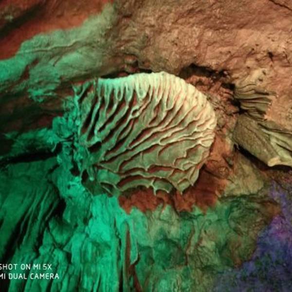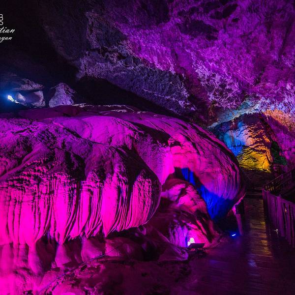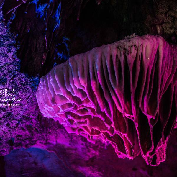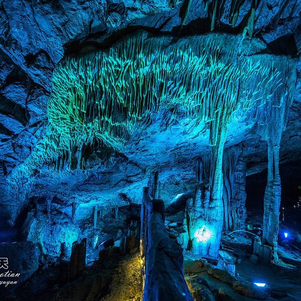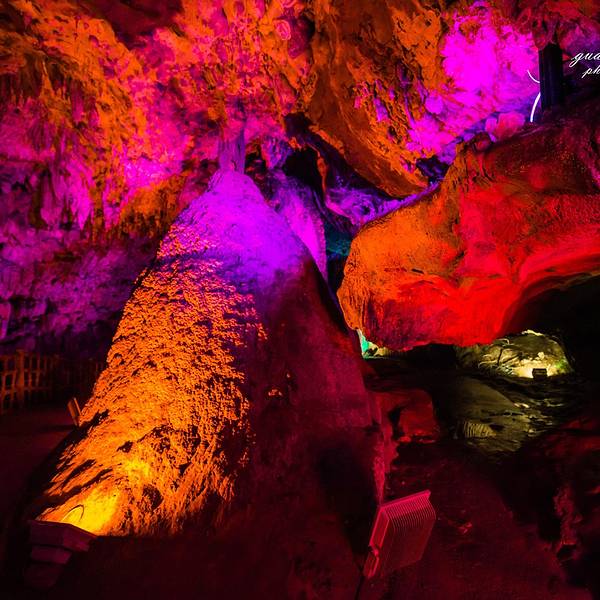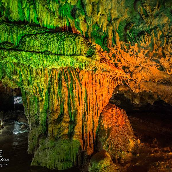 走入洞中, 凉风顿时袭来, 在炎炎夏日极其舒适, 洞中有一条地下河, 淙淙地流向大石穴中去。 洞中的每一根钟乳, 每一片岩壁, 都是一件精美绝伦的天然雕塑, 天造地设了这座神奇的地下仙宫。 在霓红灯的照射下, 千万钟乳石或像怒放的莲花从空中倒垂下来, 或像天宫的琼楼倒映在水面, 只见那洞里,碧潭金波粼粼, 花瓣晶莹明亮, 五光十色, 万紫千红, 堪胜瑶池仙境。里面的景点有: