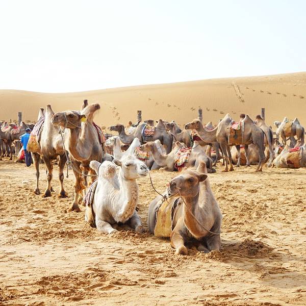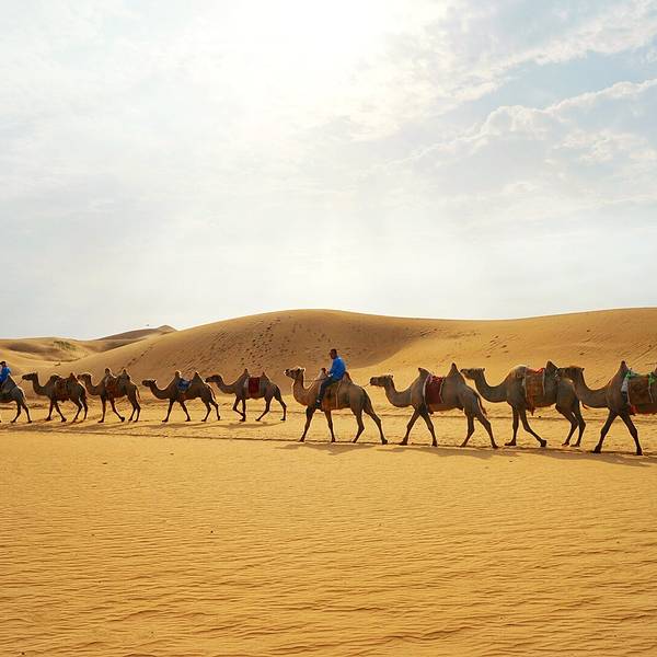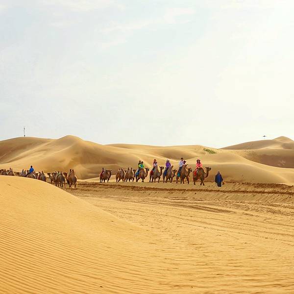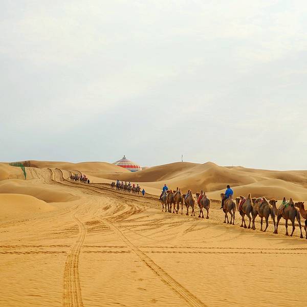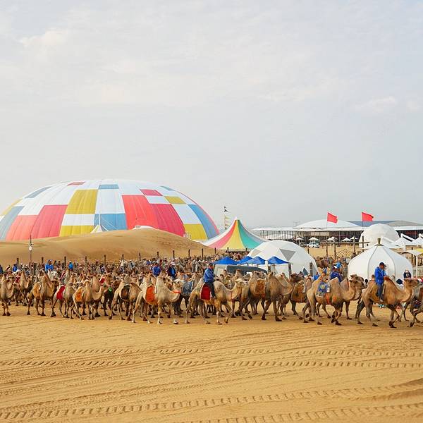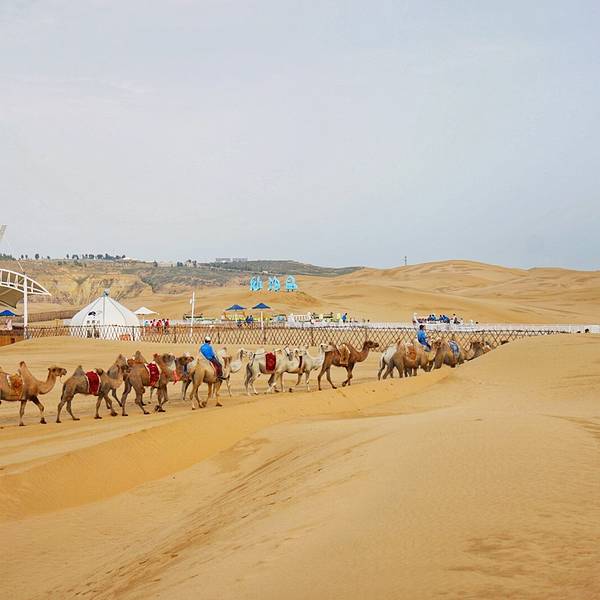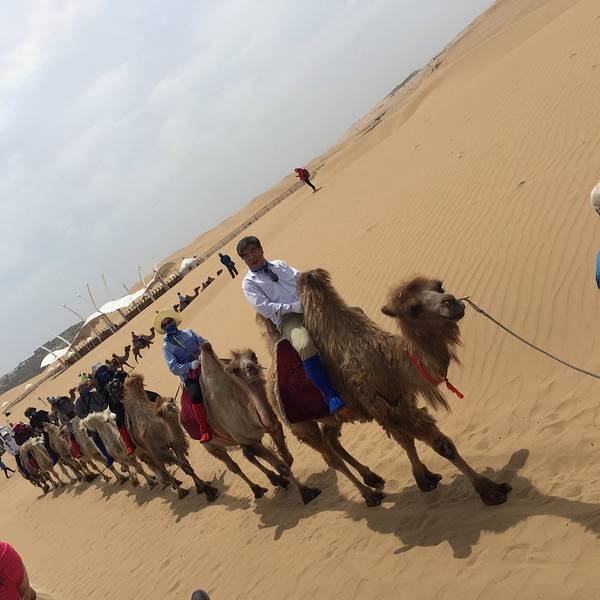 也怪这场雨,被人连连称赞的响沙湾日出、夕阳、星空统统都泡了汤。驼队从仙沙岛出发,去往远方说是夕阳下的驼队,其实有些名不副实。也怪这场雨,被人连连称赞的响沙湾日出、夕阳、星空统统都泡了汤。所以,我们得以看到这壮观的驼队时,天空只有微光几束,并没有令人魂牵梦萦的夕阳。虽说没有如同“圣光”...说是夕阳下的驼队,其实有些名不副实。也怪这场雨,被人连连称赞的响沙湾日出、夕阳、星空统统都泡了汤。所以,我们得以看到这壮观的驼队时,天空只有微光几束,并没有令人魂牵梦萦的夕阳。虽说没有如同“圣光”的夕阳作伴,但是这广阔苍茫的天地里,百余只骆驼摩擦着脚下的黄土,所经之处安静无比却尘土飞杨的景象,还是令人屏气凝神,将惊叹声种在心里。驼队从仙沙岛出发,去往远方。而在白天的营业时间,骆驼群都安静的蹲守在骆驼圈里,为游客提供接送服务。从仙沙岛到悦沙岛的交通,就靠它们啦。仙沙岛上当然也有演出项目。