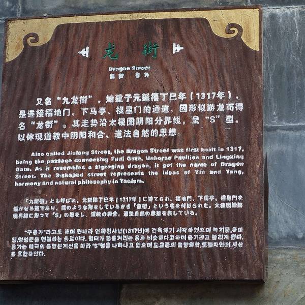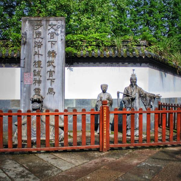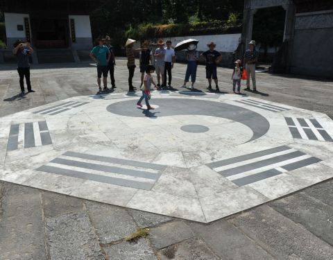 上清宫,坐北朝南,依山傍水,传说是张天师做法的地方。走进上清宫的大门,上清宫明堂中央地下镶刻一个偌大的阴阳八卦图,制造一种神秘的道教氛围。据说这上清宫的前身是天师草堂,后改为上清观,宋朝徽宗升上清观为大上清宫。上清宫有福地门、下马亭、午朝门(棂星门)、钟鼓楼 、伏魔殿等许多建筑。其中重点就是伏魔殿,《水浒传》开篇第一回:“张天师祈禳瘟疫洪太尉误走妖魔”。