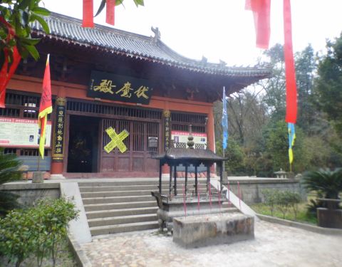 最引人注目的因当算是伏魔殿,门上交叉的封条,据说是由历代天师亲自画符、盖印、封贴大门,两边黄布上的图形就是太上老君赐给张天师的水火阴阳镇妖符,门上对联:“千年归匿风平浪静,一旦现形地动山摇”。