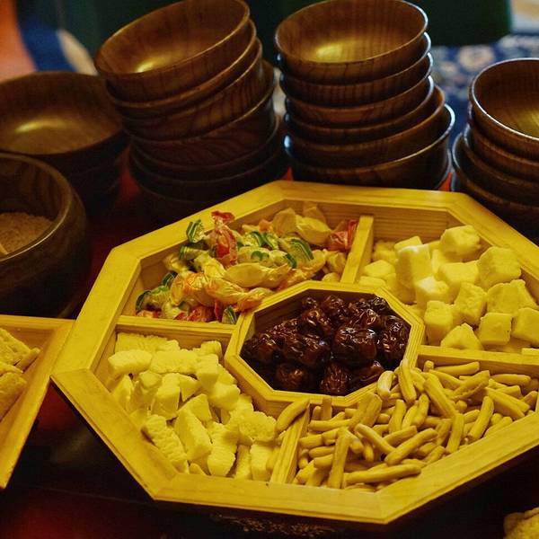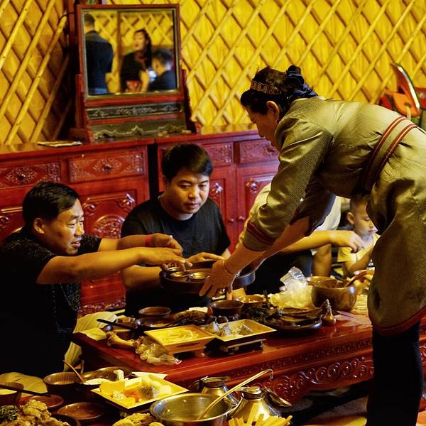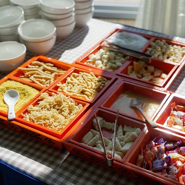 由于行程中入住的酒店都含自助餐,所以这4天3晚,吃的最多的就是酒店的自助餐厅啦。 虽说是酒店的免费自助餐,可是在菜品质量上完全不输高级餐厅。 不吃牛羊肉的我,来到内蒙古,生怕没饭吃,进餐厅一看,种类超级丰富,就算是我这样的资深挑食者,也能吃个满满当当。 莲花度假酒店的餐厅面积较大,菜品也更丰富些。从丰富多彩的主食、蔬菜肉肉、各类点心……再到内蒙古的特色美食,每一样都保质保量。在酒店入住的几天里,每一顿饭也总有特别的创新。 比如某天的下午居然全都吃起了小火锅,咕嘟咕嘟刚好驱散下雨天的潮湿。 比如某天午饭居然刚好是我爱喝的那个牌子红酒。既然置身内蒙古,蒙族特色菜当然必不可少。额吉烤羊肉深受欢迎,虽然我无福吃羊肉,但看起来都忍不住垂涎欲滴。我最爱的还是这大锅奶茶啦哈哈。 不同于市面上冲泡的奶茶,自助餐厅的奶茶都是选自本地奶源,和茶叶煮后,是货真价实的“奶茶”呢。没有过分的甜味,反而回归了食物本身的味道。福沙岛度假酒店的菜品类型跟莲沙岛很类似,就是规模和种类略少。但是莲沙岛主打蒙古风情,所以有些菜品是蒙族style,比如奶制品小零食……两家酒店的客人,都可以免费用早、午、晚餐,花样繁多,每天都有惊喜。 除了酒店的自助,在莲沙岛还可以预约蒙餐,由蒙组大叔亲自烹制,同行的小伙伴最喜欢大块的羊肉,不能吃羊肉的我……最钟爱这个酸奶啦。一入口酸的鸡皮疙瘩都起来,但是强撑着不放糖,几口之后意外的甘甜。除了特色的羊肉和酸奶,还有其他蒙族特色的美食。吃饭的过程中,会有蒙族的小哥哥小姐姐过来唱歌表演,还可以体验蒙族的喝酒仪式。 蒙族阿姨端上酒来,客人要用无名指沾酒,上点下点,然后点在额头上。烈酒配上悠扬的蒙语歌曲,应景的很。最爱的是一个蒙族小哥哥唱的一首《鸿雁》,第一次听蒙语版的《鸿雁》,内心激荡,苍凉壮阔之情悠远……