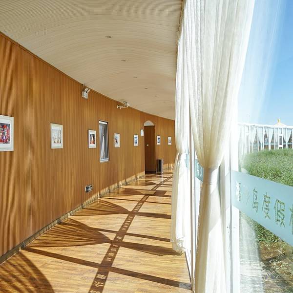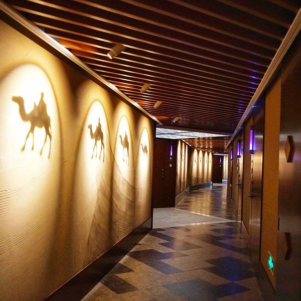 我最爱的是这个走廊,一边的墙壁上挂满了响沙湾景区的美景图,另一面大大的落地窗,透过窗能看到酒店...