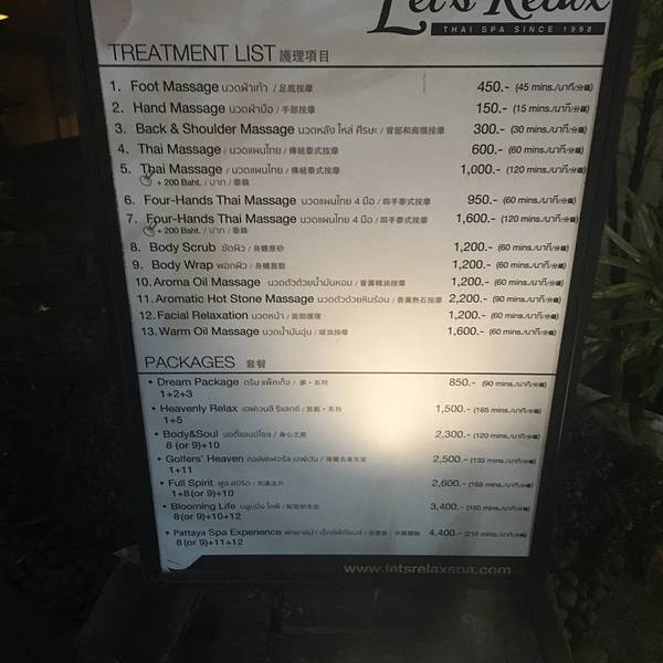 提前在网上预约买套餐的话,有折扣,比较划算let''s relax是泰国有名的连锁按摩品牌,在曼谷,清迈,普吉岛都有分店,芭提雅也不例外。提前在网上预约买套餐的话,有折扣,比较划算