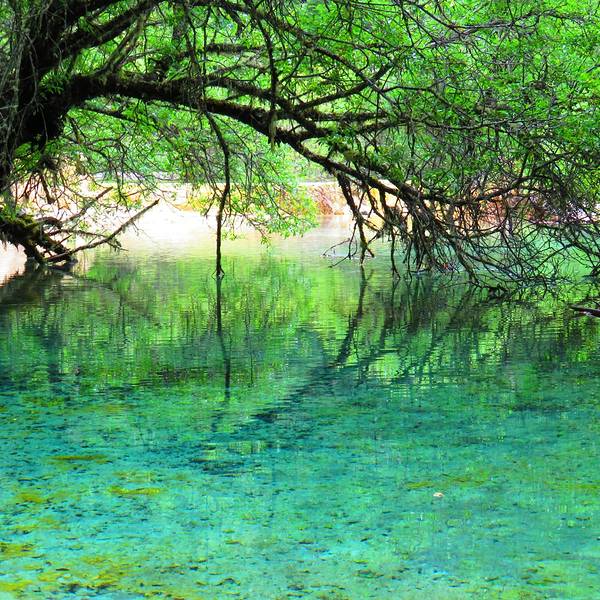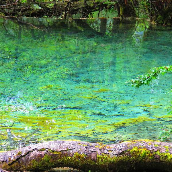 水池紧傍森林,景观雄奇壮丽,恬静素雅,使人油然产生一种空灵、隽永的兴味。池面光洁如镜,水质清丽碧莹,天光云影,雪峰密林,倒映池中,镜像清晰,色泽艳丽。