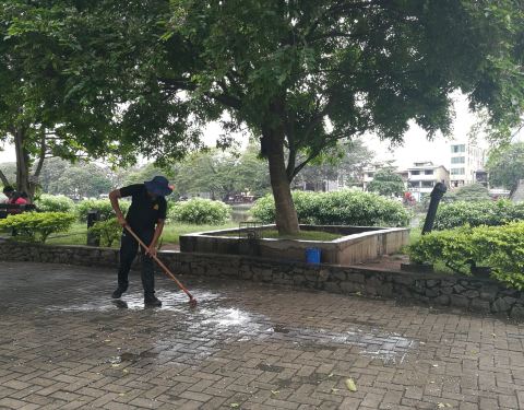 公园里还有野鸭子,也不是太怕人,但是也很难接近。工作人员正在做清扫,用谁冲洗地面,打扫得还是挺干净的