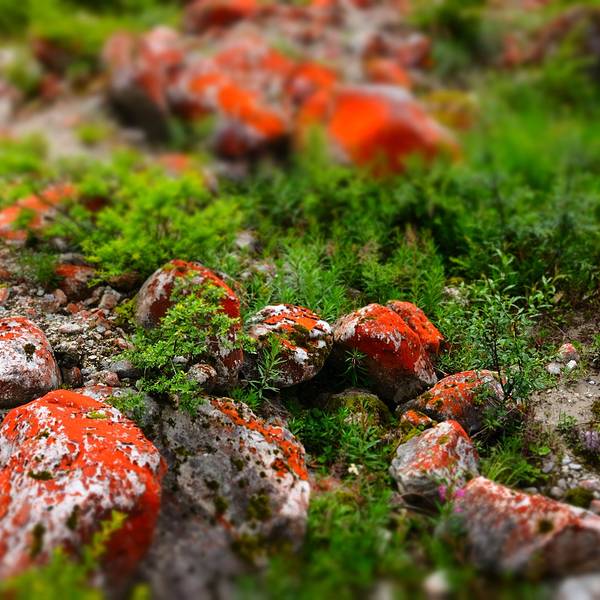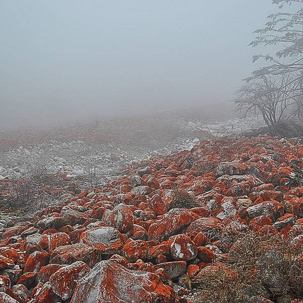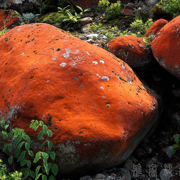 红石的颜色来自于一种独特的气生丝状绿藻,中科院的刘国祥老师将此种特殊的藻类命名为约利橘色藻雅家梗变种。咦?这不是红色的么?其实它还真是橘色的,只是比较偏红而已。仔细看可以发现它其实是橘色的。因为用相机的红色滤镜根本拍不出来,用橘色滤镜可以轻松拍出来。咦这不是绿藻么?怎么又是橘色的?其实绿藻叫绿藻不代表它就是绿色的,就好像太湖里面的蓝藻并不是蓝色的而是绿色的一样。约利橘色藻里面虽然有一定的叶绿素(毕竟还是绿藻),但是更是含有大量的类胡萝卜素,这些色素能够帮助橘色藻抵抗高海拔地区强烈的紫外线损伤。