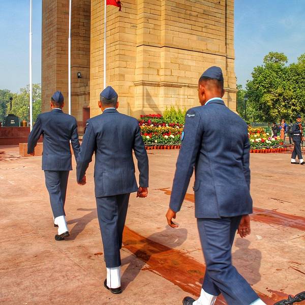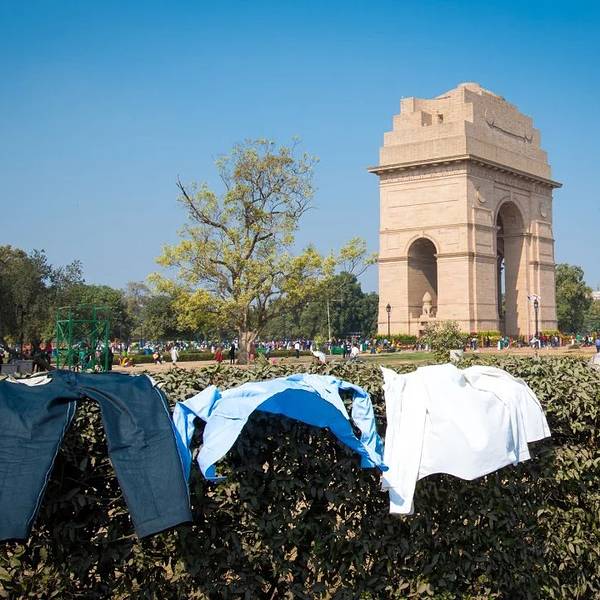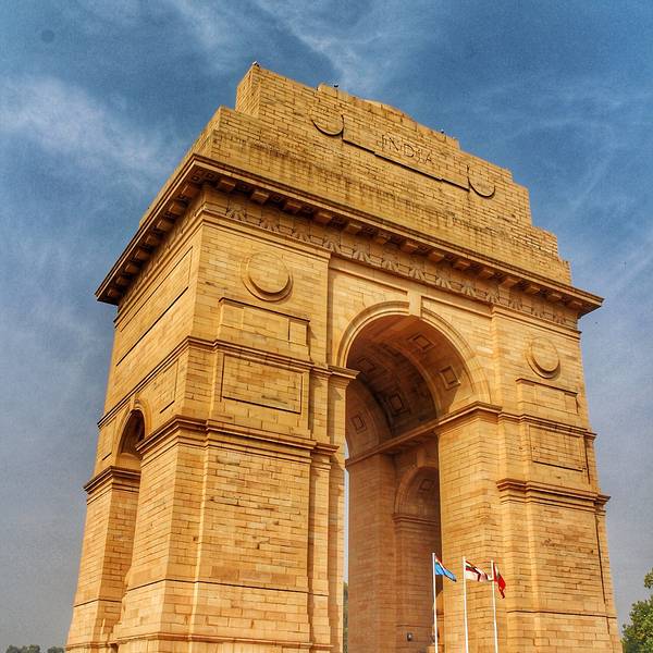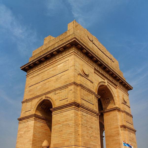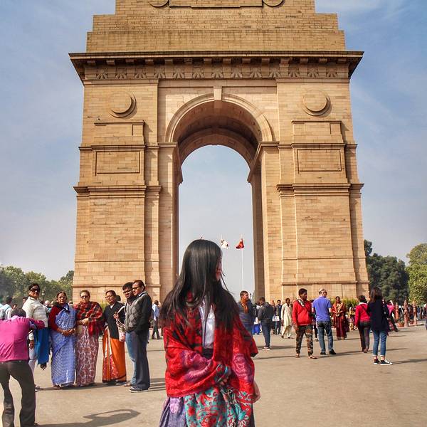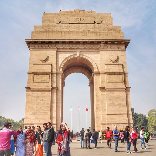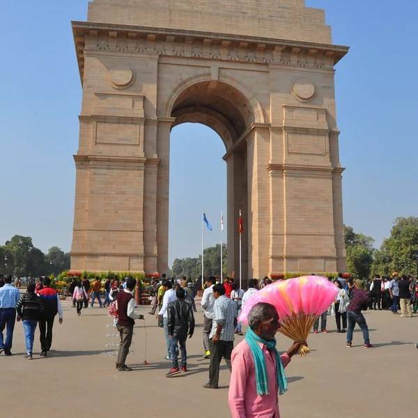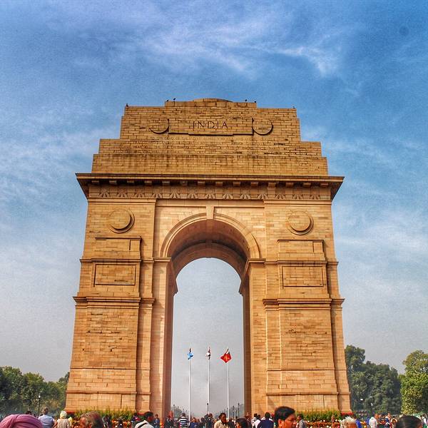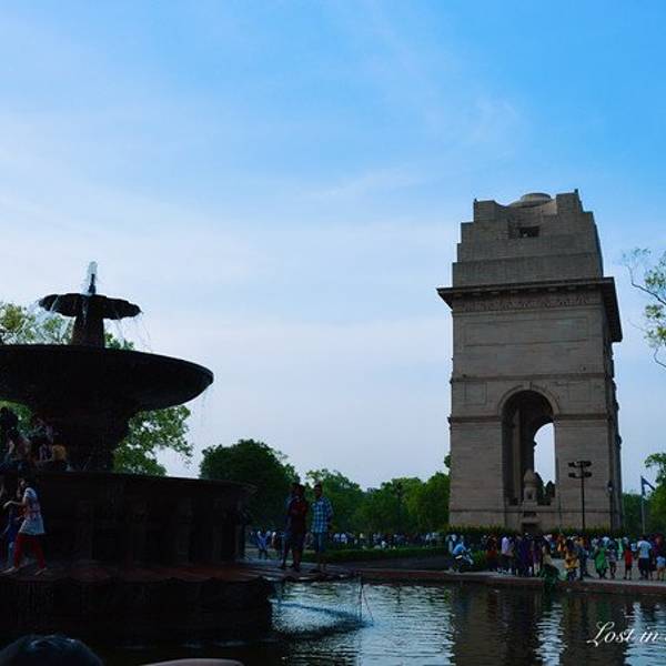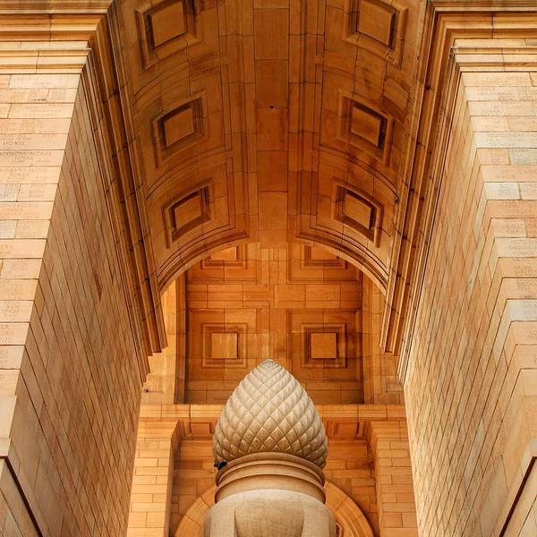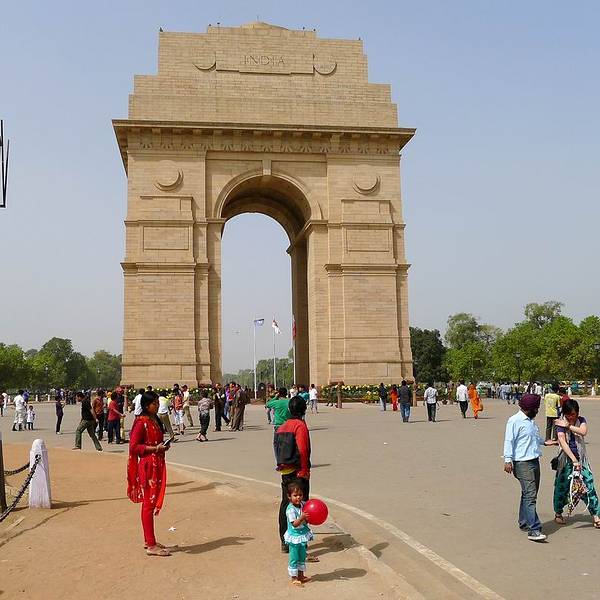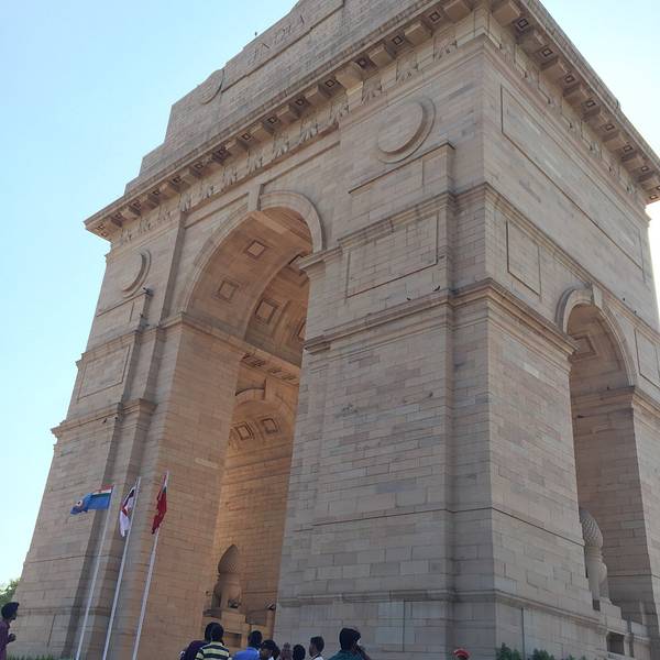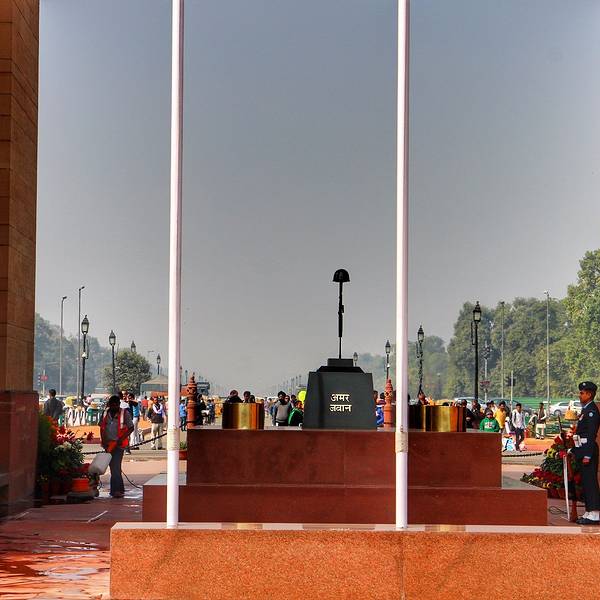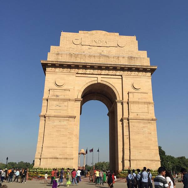 印度门位于国王大道(Rajpat),于1931 年建成,原是全印战争纪念碑。建立这个纪念碑最初是为了纪念在一战和第三次英国—阿富汗战争中为英属印度作战而阵亡的82000 名士兵,后来这个纪念碑成为纪念为印度而牺牲的所有士兵的纪念碑。1971 年,孟加拉解放战争后,在印度门底下增加了一座黑色大理石火焰台,燃烧着永不熄灭的烈士之火(Amar Jawan Jyoti)。印度门是德里的地标建筑,其设计者是新德里的缔造者埃德温• 鲁琴斯爵士,由于其气势恢宏,且拱形外形与法国凯旋门相似,又常被当作凯旋门的再造之作。印度门下有印度军队值岗,守卫着烈士之火。印度门前的国王大道车流不息, 而且同样具有政治意味, 连接着总统府等核心部门。