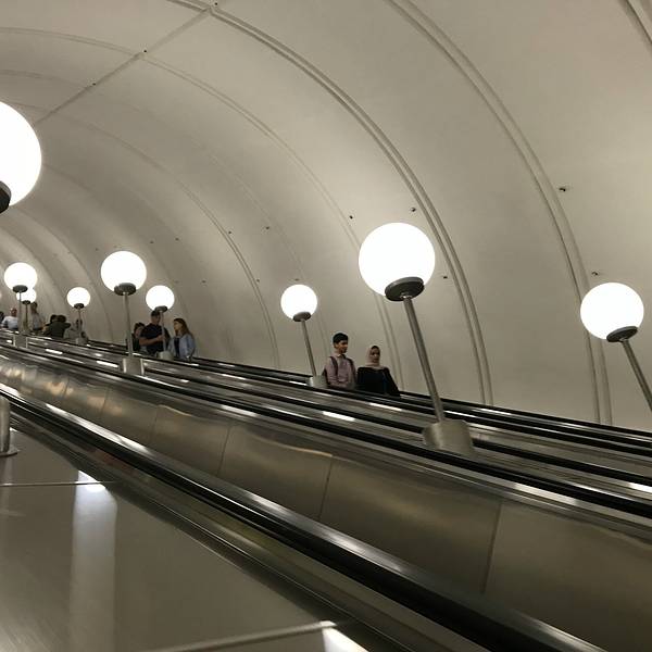 胜利广场站的特点是莫斯科最深的地铁站,导游介绍说深达178米,在候车大厅的尽头有一副油画还挺有意义的