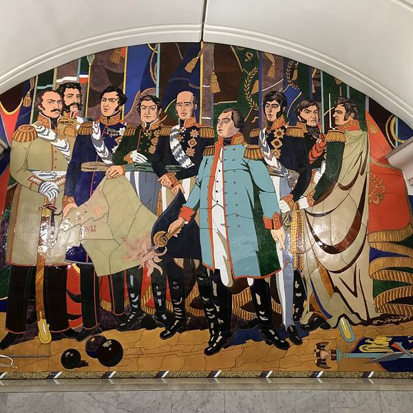 来莫斯科旅游其中有参观地铁站,但不是这个站,是金碧辉煌的莫斯科站,问了导游为什么换了,答复,从这里到下一个景点顺道。 胜利广场站的特点是莫斯科最深的地铁站,导游介绍说深达178米,在候车大厅的尽头有一副油画还挺有意义的。