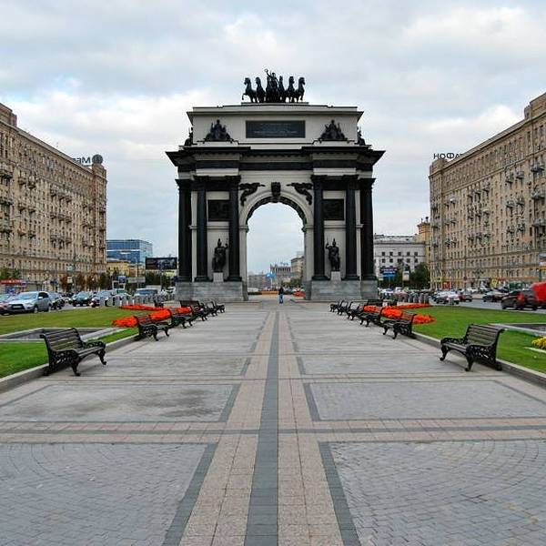 胜利广场站位于深蓝线西部,开放于2003 年6 月5 日,得名于附近的胜利广场。地铁站深84 米,是莫斯科最深的地铁站,也是世界上三大最深地铁站之一,乘坐扶梯出入站需要大约3 分钟的时间。胜利广场站由两个平行的大厅构成,由深浅不同的棕色大理石装饰,在两个大厅的尽头分别有一幅由祖拉布·采列捷利创作的1812 年卫国战争主题的壁画。