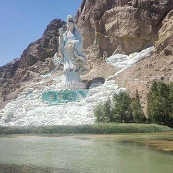 赤金峡位于酒泉玉门市赤金镇,是由赤金峡水库而建起的景区。水库面积很大,长约有4公里,宽也有1公里左右,周围有河流、树林,可以观赏到西北罕见的湖泊河流、树木成荫的优美风景,在河上还可以体验赤金峡的激情漂流。赤金峡还是汉朝以前老玉门关的所在地,因此景区还在此修建了城楼、滴水观音等人文景观可供观赏。赤金峡景区大约长2公里左右。先从景区大门进入后步行观赏路上的人文建筑和芦苇荡、玫瑰园等自然风光,然后登上水库大坝欣赏大湖景色,后体验激情赤金峡漂流,整个景区游玩下来大概需要半天时间。景区位于水库的北侧,开车行至景区附近时便可以看到周围的景色骤然一变,由西北的戈壁荒凉转为河边绿洲的树木成荫的优美风景。从北侧的大门进入景区,首先便可以看到对面的山上几条五颜六色的彩色雕塑龙盘踞在山上,这也是赤金峡景区的标志性雕塑。走进景区,在河边建设了玉门关、宣统塔、赵公祠等人文建筑,不过基本都是新修建筑,并没有什么古迹。旁边则是小朋友们的乐园,水上世界、碰碰车等娱乐项目都可以在此游玩,河岸对面的山上可以体验景区内的高空滑索,惊险刺激,而河上的吊桥长几十米,走在上面摇摇晃晃,也是一种特殊的体验。沿着一条坡道一直向前,可以看到路边的芦苇荡、红柳林和沙枣树林等,景色清幽,每到春夏季节还有沙枣花、玫瑰花等在此开放,非常漂亮。在坡道上行进时可以看到河岸对面有一座巨大的滴水观音雕像,彩色的雕像栩栩如生,壮观美丽。坡道走到尽头时便来到了水库的台阶下,沿着几十级台阶上行到水库大坝上,几公里长的水库大湖便映入眼帘,景色开阔壮观,微风拂来时清凉舒爽。还可以在此乘坐快艇游湖,每人约20-30元,摩托艇每人约70元,体验湖面上的激情和惬意。参观完景区内的风光后便可以走下大坝来到大坝旁的漂流处,在此处体验传说中的“西北第一漂”激情漂流,赤金峡漂流长度共6公里,大约需要1.5小时,周围都是河边的绿洲风景,清新美丽。河水不深十分安全,所以大家也会玩的更加肆意一些,经常有人跳船站到河中泼水,景区还会安排专人在河道边泼水为漂流增加激情。到达漂流终点处有乘坐免费的景区接驳车送游客回到景区大门附近,可以继续参观或者离开景区。