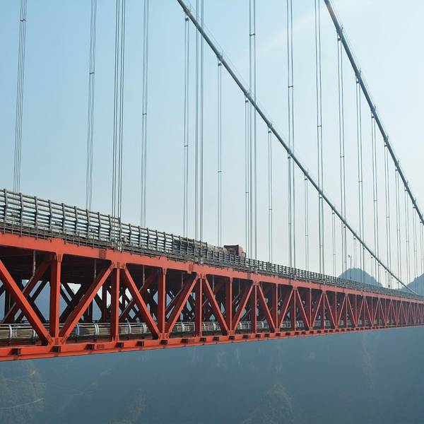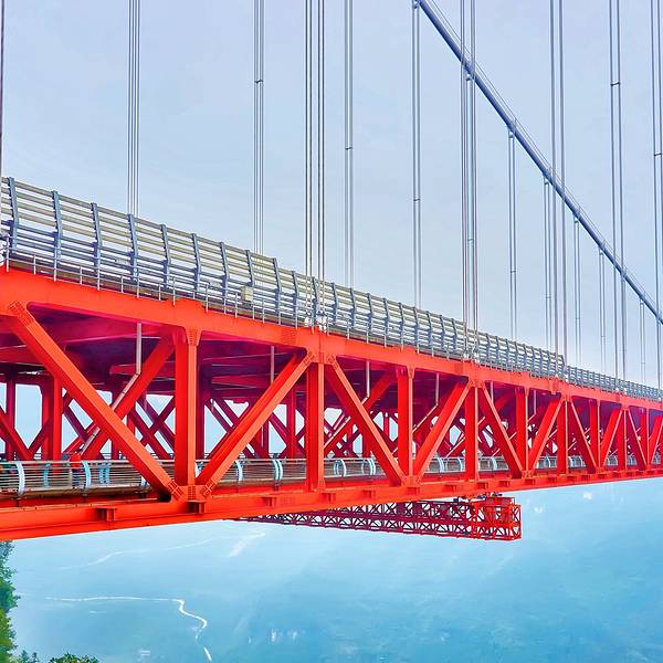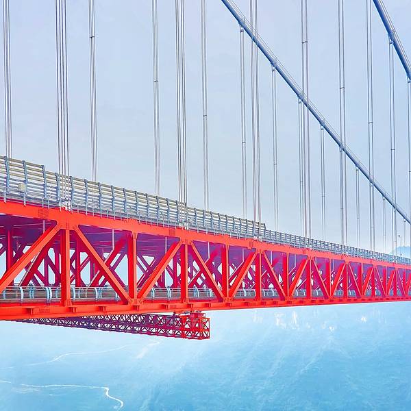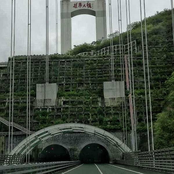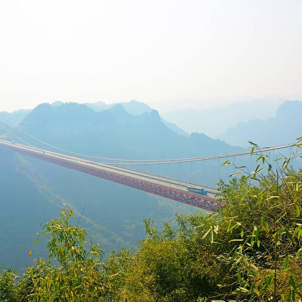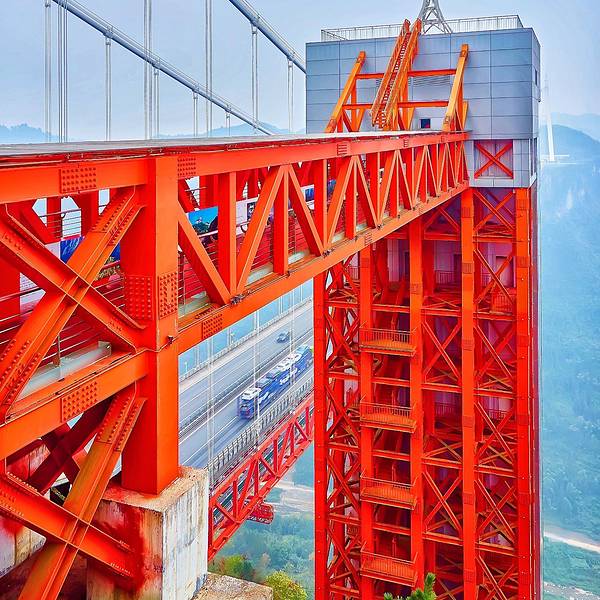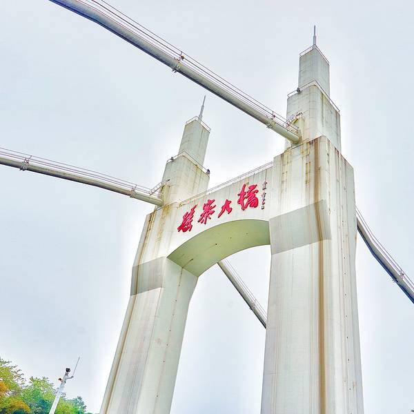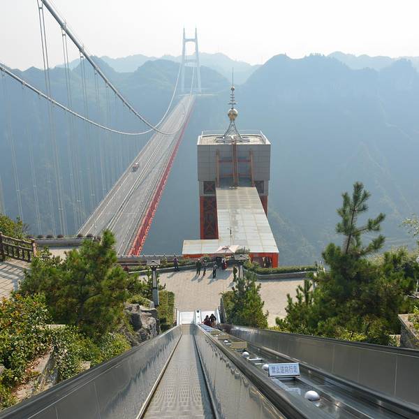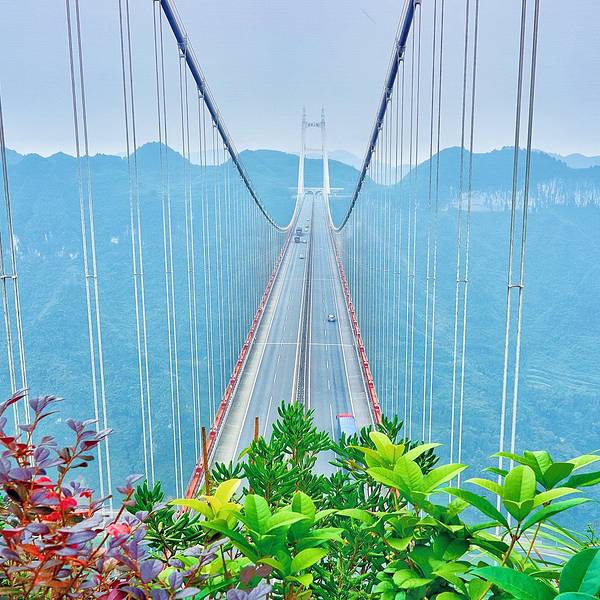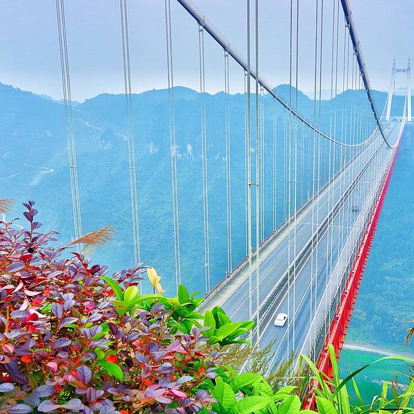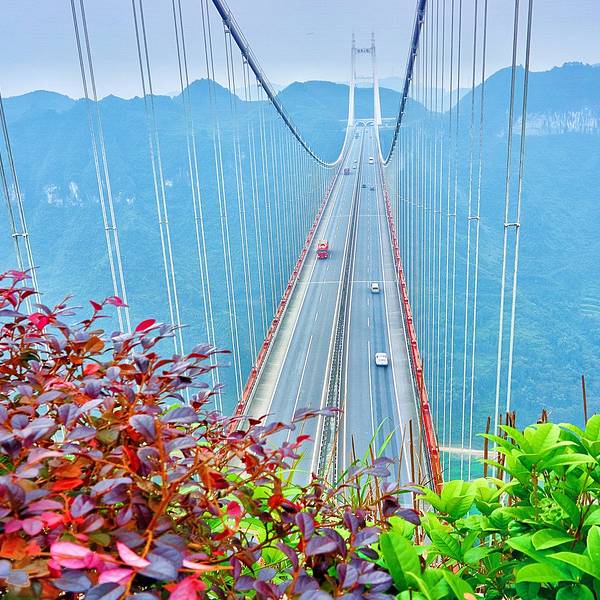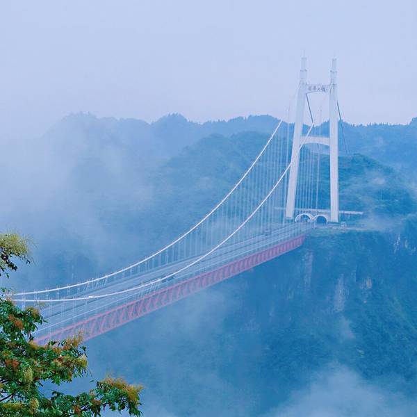 寨特大悬索桥,位于湖南湘西矮寨镇境内。矮寨悬索桥,距吉首市区约20公里,跨越矮寨镇附近的山谷,德夯河流经谷底,桥面设计标高与地面高差达330米左右。桥型方案为钢桁加劲梁单跨悬索桥,全长1073.65m,悬索桥的主跨为1176m。该桥跨越矮寨大峡谷,主跨居世界第三、亚洲第一。工程计划投入7.2亿元,占吉茶高速公路计划总投资的15%。2012年3月底,创4项世界第一的湖南矮寨特大悬索桥正式通车。 大桥创下四项世界第一纪录,一是大桥主跨1176米,跨峡谷悬索桥创世界第一;二是首次采用塔、梁完全分离的结构设计方案,创世界第一;三是首次采用“轨索滑移法”架设钢桁梁,创世界第一;四是首次采用岩锚吊索结构,并用碳纤维作为预应力筋材,创世界第一。