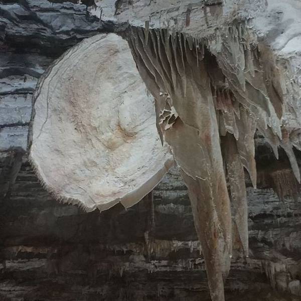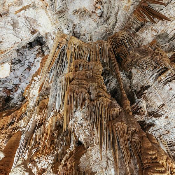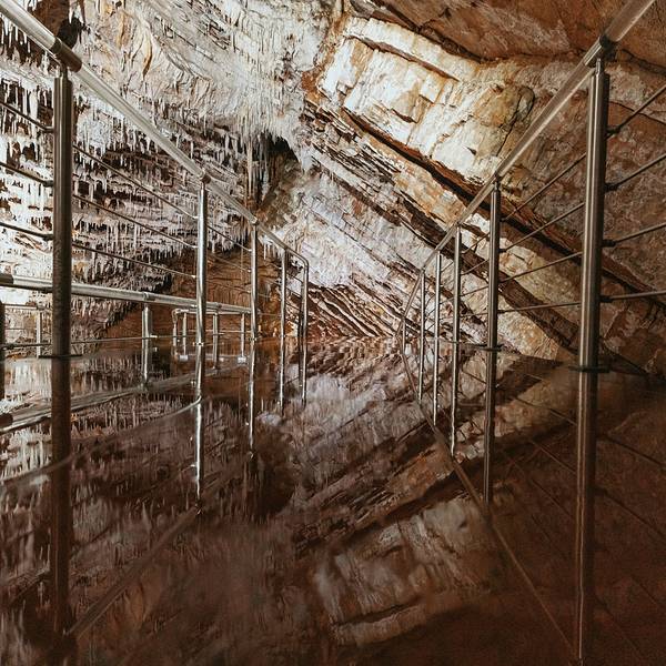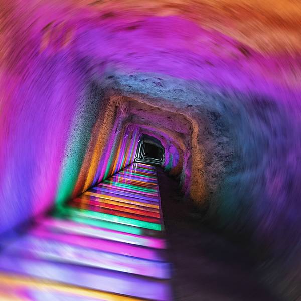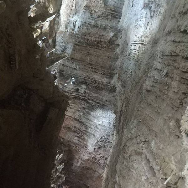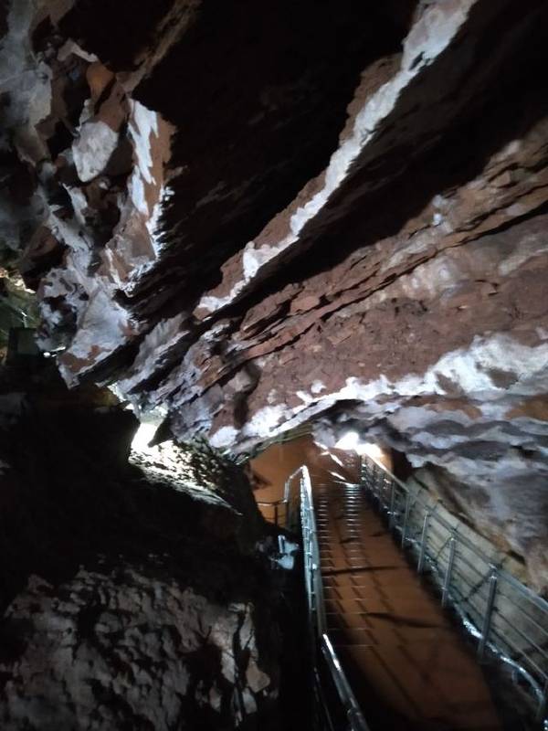 从入口处往溶洞走,会经过一段绚丽的彩色长廊。长廊好像一个时空隧道,穿越之后才能进入耗时亿万年形成的古老溶洞里。一进溶洞,空气瞬间变得潮湿。整个洞都在淅淅沥沥地滴水,溶洞内部的空间非常大,走在里面有一种“人在雨中行,胸中天地宽”的感觉。水滴落在石上,溶洞继续生长。溶洞地面很湿滑,行走的时候必须全神贯注,开不得小差。洞顶的钟乳石低垂,洞底的石笋高耸,两者针锋相对却又互相映衬。