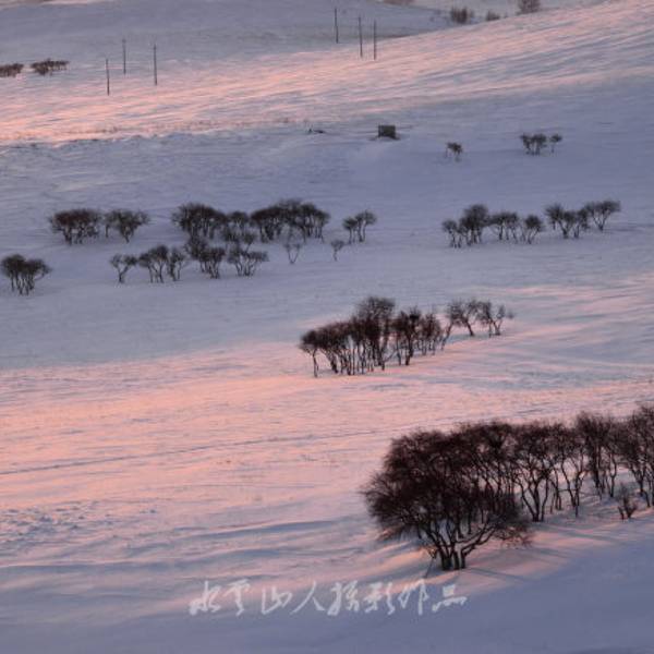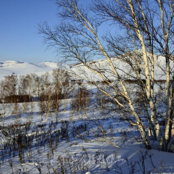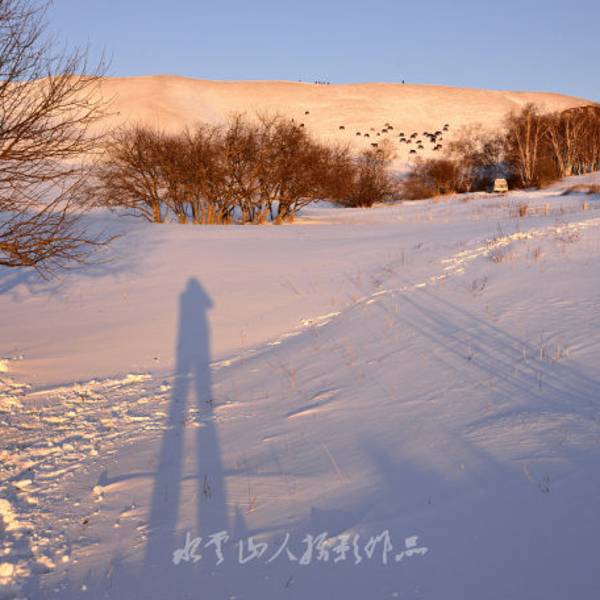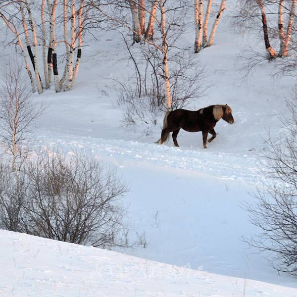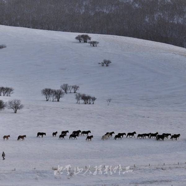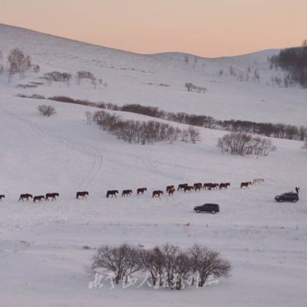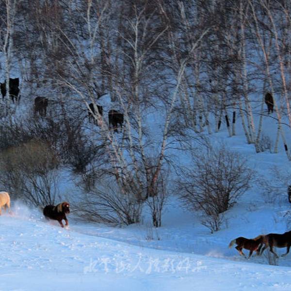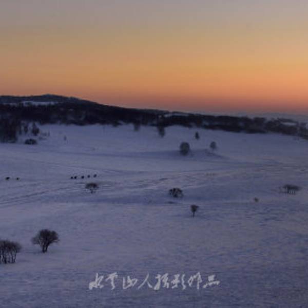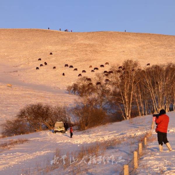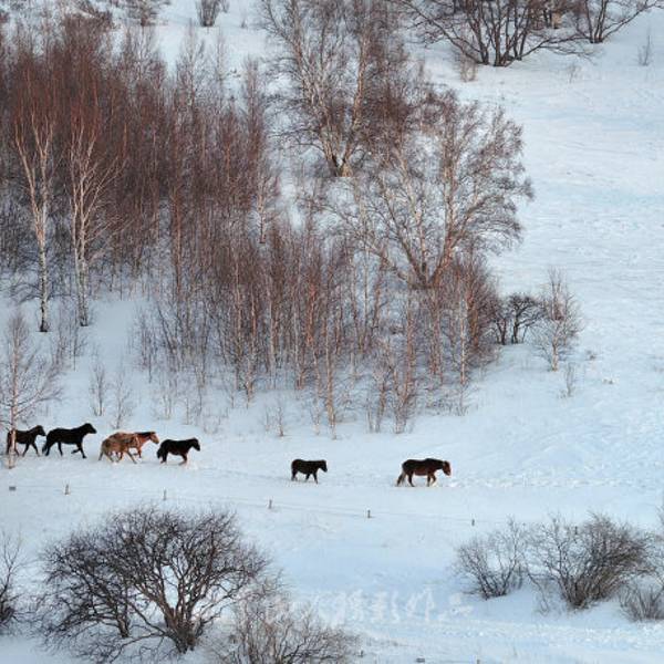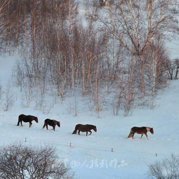 北国风光,晴空雪原,水墨桦林,塞马点点。16点返回到夹皮沟,拍摄桦林落日牛羊下