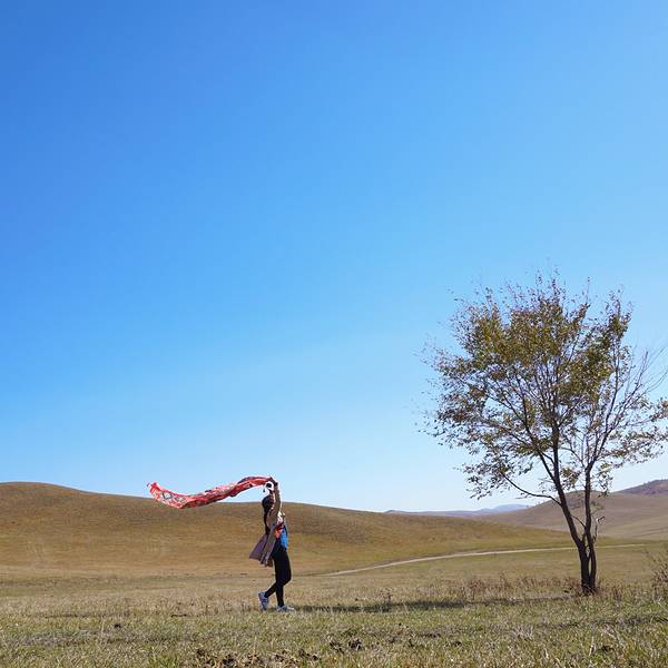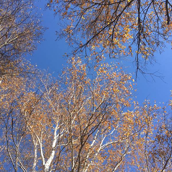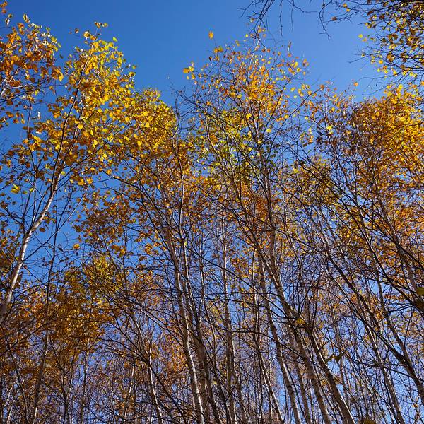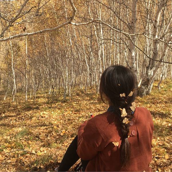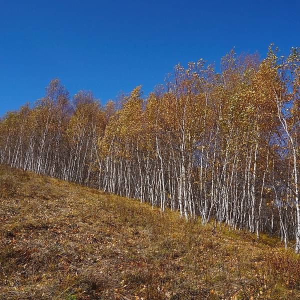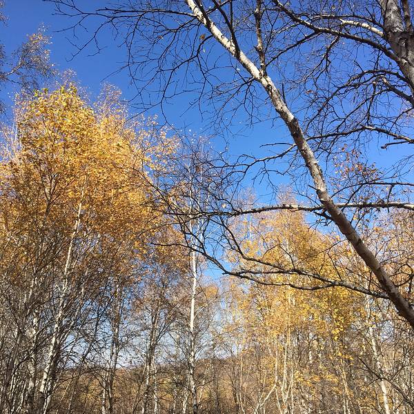 最美的落叶。第一站,夹皮沟,我们选了一个人比较少的小山坡去看白桦林的秋色。一人一树一景