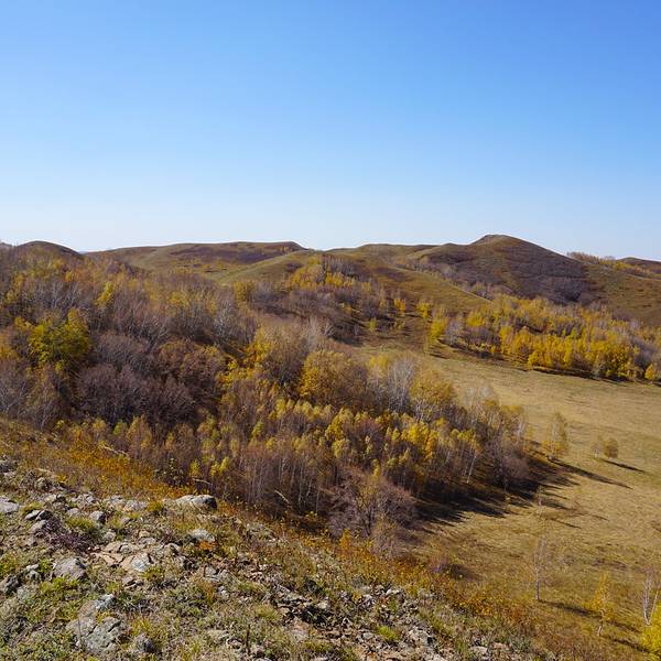 第一站,夹皮沟,我们选了一个人比较少的小山坡去看白桦林的秋色一人一树一景年轻的白桦树白桦林最美的落叶黄色和蓝色真的很配一叶知秋渐渐被染黄的山坡
