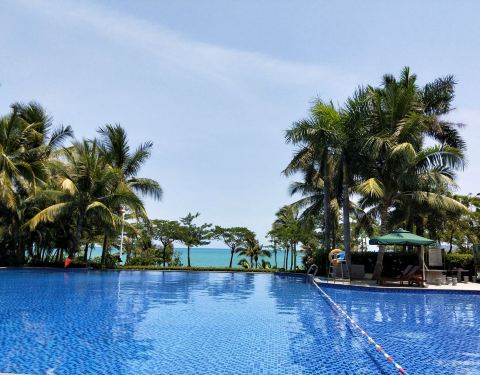 这个性价比超高,过了马路就是三亚湾,早晨可以在泳池边吃饭!