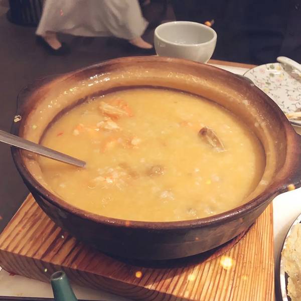 可以说在潮堂get了吃过最好的潮汕牛肉丸了。丸子表面开了花刀非常入味,但又不会抢了牛肉本身的味道,切成两半可圈可点,口感劲道! 再说另一款必点的菜式——海鲜砂锅粥:真的与众不同!一窝粥里藏着小十只大虾...