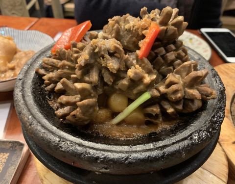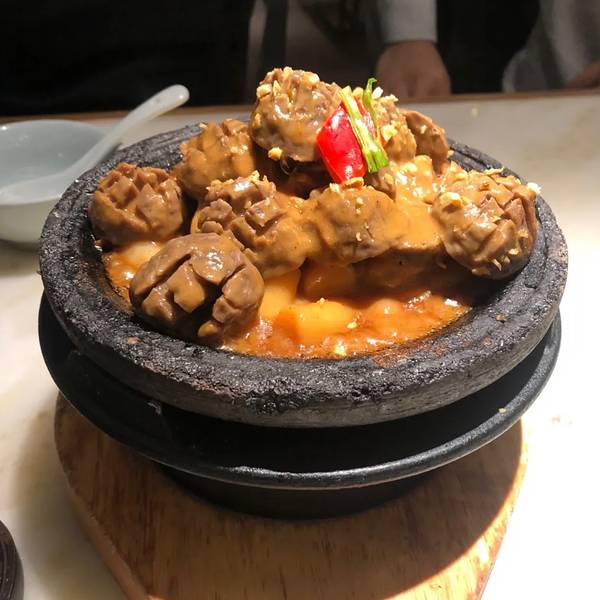 鱼石锅手打牛肉开花丸,炖过之后,然后上面淋上了特制酱,味道很nice,和这个牛肉丸也比较搭!牛肉丸就是手打的,满满的肉感,口感超级Q弹劲道~