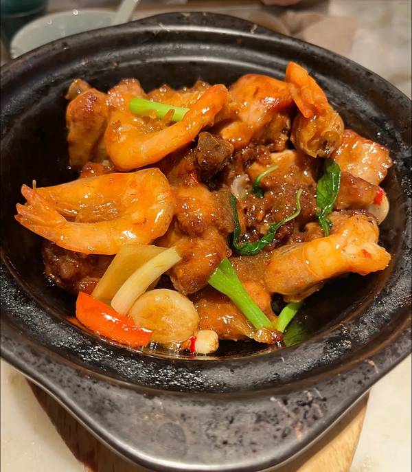 鱼潮州虾油走地鸡,这个虾和鸡肉一起烹饪的,看起来色泽真的太棒了,浓浓的酱油感,看起来很亮泽很有食欲!确实味道很可以啊,虾肉紧实,鸡肉鲜嫩劲道,真的值得一尝!